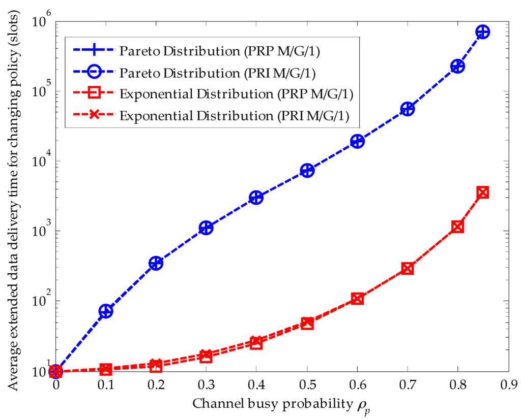 Figure 5 compares the effects of the upper-truncated Pareto distribution and the exponential distribution for primary connections in the PRI M/G/1 and the PRP M/G/1 analytical frameworks when the changing policy is adopted. In both analytical frameworks, the upper-truncated Pareto distribution for primary connections results in a larger extended data delivery time than the exponential distribution for primary connections. This is because the second moment of the upper-truncated Pareto distribution is larger than that of the exponential distribution . Furthermore, in the changing policy, the delay in a secondary connection caused by the repeat scheduling discipline can be omitted for the reason that the second moment of the upper-truncated Pareto distribution and exponential distribution results in a huge delay.