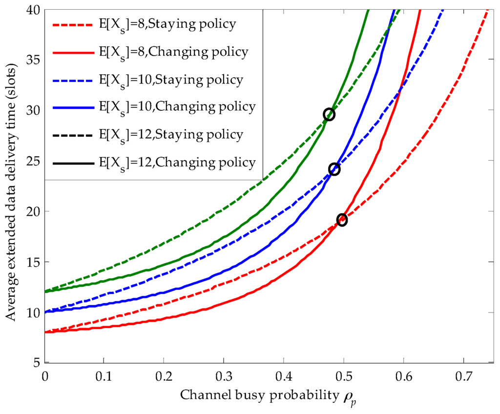 In this figure, we define the cross point as the decision point, and let A and B denote the decision point in the PRI M/G/1 and the PRP M/G/1 queuing networks, respectively. In other words, if the channel busy probability resulting from the arrival of the primary connection lies on the left side of decision point A (i.e., ), the secondary connection will execute the changing policy for shorter average extended data delivery time in the PRI M/G/1 queuing network. On the contrary, if , the secondary connection will adaptively choose the staying policy. Similarly, in the PRP M/G/1 queuing network, when lies on the left side of decision point B (i.e., ), the secondary connection will adopt the changing policy. On the contrary, when lies on the right side of decision point B (i.e., ), the secondary connection will adaptively adopt the staying policy. In addition, the decision point A lies on the right side of the decision point B for the reason that the repeat scheduling discipline results in larger delay in the PRI M/G/1 queuing network than the resume scheduling discipline does in the PRP M/G/1 queuing network.