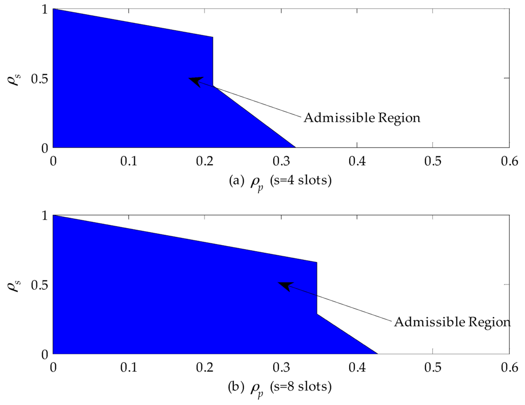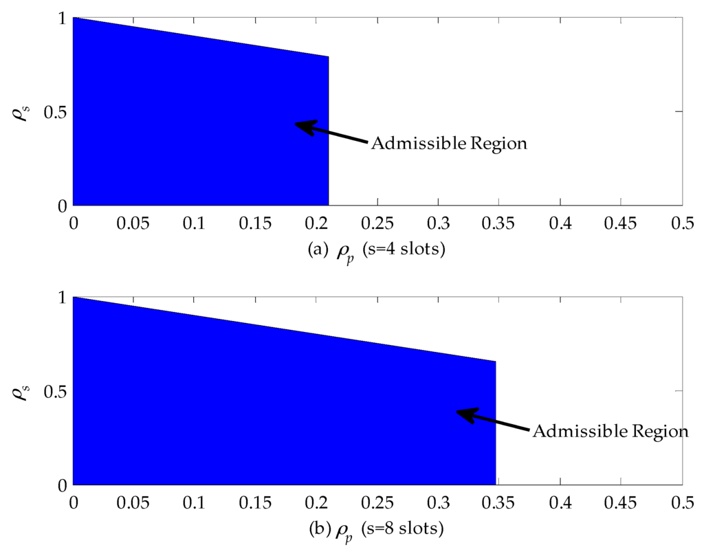 Figure 8 shows the admissible region of a CR network when the service time of the primary connection follows the upper-truncated Pareto distribution and the admission control policy can be designed based on these results. From Figure 8a, we can find that when , the CR can accept all secondary connection requests as long as they satisfy the queue stable condition, i.e., . In the case that , the CR network will reject any secondary connection request, because the delay is only related to channel busy probability for given (slots) and (slots) and exceeds the maximum allowable delay according to Equation (39). In addition, by comparing Figure 8a,b, we can obviously see that the horizontal coordinate of the admissible region extends from 0.2 to 0.345. That is because the maximum allowable delay is set to be eight slots, which is two times as large as before. Therefore, the secondary connection request can be accepted as long as the channel busy probability is no larger than 0.345.