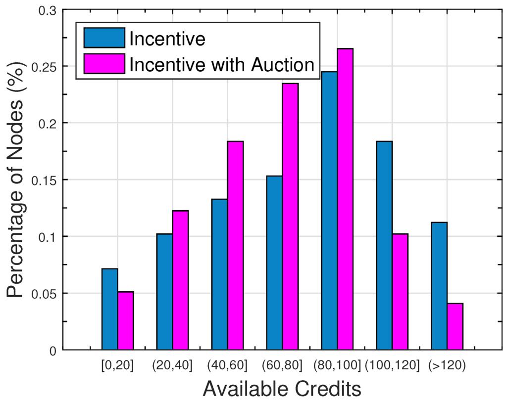 Figure 2 illustrates the distribution of available credits under “incentive” and “incentive with auction”. Credits are consumed for replies and feedbacks. The more credits a user owns, the more queries it can disseminate and the more feedbacks it can retrieve. We can see that most users have available credits less than 120; this is because they all hold some replies and feedbacks waiting to be delivered to the query issuers and data providers. Fifty four percent of users keep their available credits around 40 to 100 in “incentive”compared to in “incentive with auction”. This indicates that the auction process helps users keep a better balance of credit retrieval and consuming.