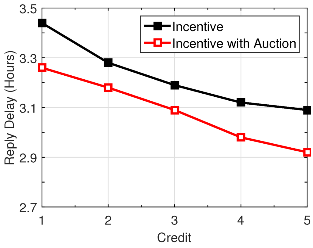 Figure 3 shows the performance of the query reply delay if we change the credit amount of one query. A user is chosen as an example, while similar results are observed for other users, as well. We increase its credit amount from 1 to 6, while all other queries keep one. As can be seen, the query reply delay decreases with the increase of credit. This is because a higher credit indicates more rewards if a user successfully delivers the query, resulting in stronger incentives to stimulate nodal collaboration.