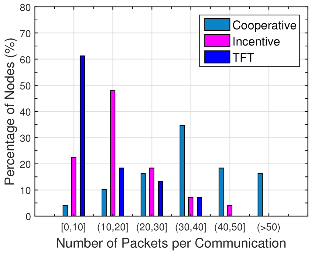 Figure 4 illustrates the average number of packets exchanged when two users meet. We can see that “incentive” exchanges more packets than “TFT”, but less than “cooperative”. The more packets are exchanged, the more resources are consumed. Sixty-one-point-two percent of users in “TFT” exchange less than 10 packets per communication, because the constraints in “TFT” enforce bilateral balances. Sixty-nine-point-four percent of users in “cooperative” exchange more than 30 packets per communication. In “incentive”, users keep a good balance between their own gains and contributions to the network. Forty-eight percent of users exchange 10 to 20 packets per communication. Since “incentive with auction” does not impact the packet exchange factor, we omit its performance here.
