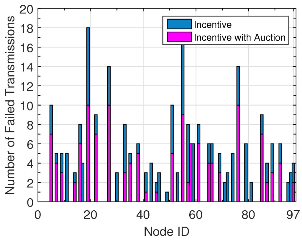 The distribution of failed transmissions among users is depicted in Figure 5. The failed transmissions are due to the lack of cooperation opportunities, which consequently leads to credit shortage. We can see that of the users do not have any failed transmissions, and the average number of failed transmission is less than five, showing that the two-person cooperative game helps both users obtain gains and prevents unilateral benefit. Furthermore, the auction process helps about of users reduce their failed transmissions, thus improving the credit circulation in the network.