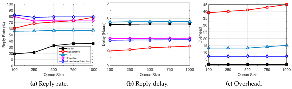 Figure 7, Figure 8 and Figure 9 illustrate the performance trend with the variation of several network parameters based on the Haggle trace. The DieselNet trace shows a similar trend. With the increase of queue size, the query reply rate of all schemes increases (see Figure 7). Particularly, “cooperative” increases significantly, because a longer queue allows more data packets to be buffered for a longer time, thus increasing the probability of query delivery. At the same time, query delay decreases. On the other hand, the overhead increases rapidly. Since “TFT” is constrained by the amount of traffic forwarded for others and “incentive” and “incentive with auction” exchange data packets based on self interests and aim to maximize their rewards, the increase of queue size has marginal impact on the performance of “TFT” and the proposed “incentive” and “incentive with auction”.