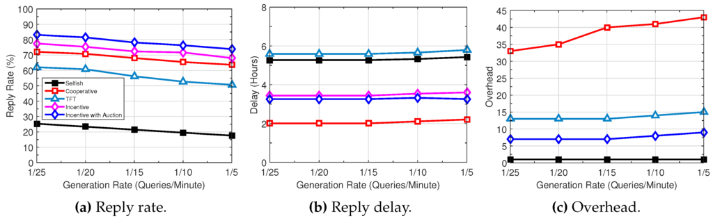 The shorter delays of “cooperative”, “incentive” and “incentive with auction” are contributed to by the fact that they leverage the packet value to estimate the probability to deliver the packet and choose the best routes to forward it. “Selfish” exhibits the longest delay because a query is delivered and replied to only when the query issuer and the data provider meet directly. Although the source in the “TFT” scheme specifies the complete route for each generated packet, packets may not always follow the best routes due to the “TFT” constraint and results in a longer delay. Moreover, “cooperative” has a much higher overhead than “incentive”, because its altruism leads to more packets to be duplicated and distributed in the network. In contrast, the proposed “incentive” and “incentive with auction” achieve very low overhead, because a user receives a query only if the query is redeemed as a benefit for the user. Clearly, the overhead of “selfish” is always one, because a user only replies to the queries in its own categories.