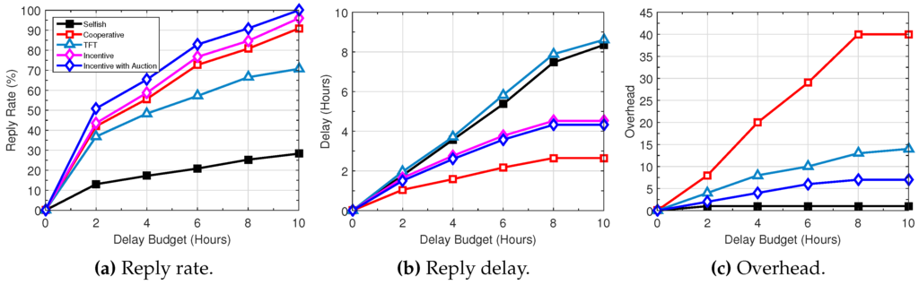 Figure 9 compares the performance by varying the delay budget of queries. Figure 9a shows that with the increase of the delay budget, all schemes achieve a higher query reply rate. We notice from Figure 9b that most queries can be replied to within eight hours in “cooperative”, “incentive” and “incentive with auction”, while “selfish” and “TFT” need to keep queries longer in the queue. Moreover, the overhead of all schemes increases with the increase of the delay budget. This is because a longer delay budget allows queries to stay longer in the queue, resulting in a better chance to be duplicated and distributed in the network.