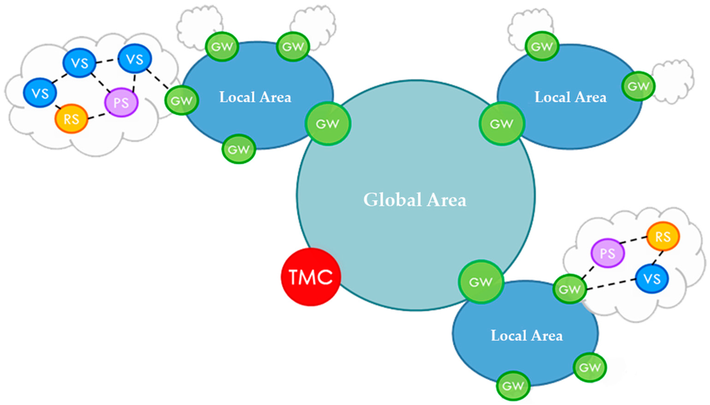 A logical view of the architecture, which shows the previously introduced concepts of GW and local/global area, is reported in Figure 1. All of the Local Areas are logically connected to a global one supporting inter-area communication, while physical communication happens through the backhaul technologies and the Internet.