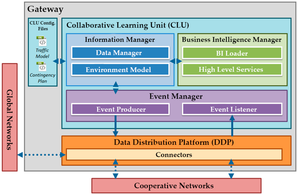 - Collaborative Learning Unit (CLU). Along with the DDP, CLUs are other key software elements of the proposed architecture, which are responsible for providing intelligence to the whole system. These units are able to learn from each situation in order to provide different actions plans in real time. The functionality of the CLUs will be further described in Section 3.3.