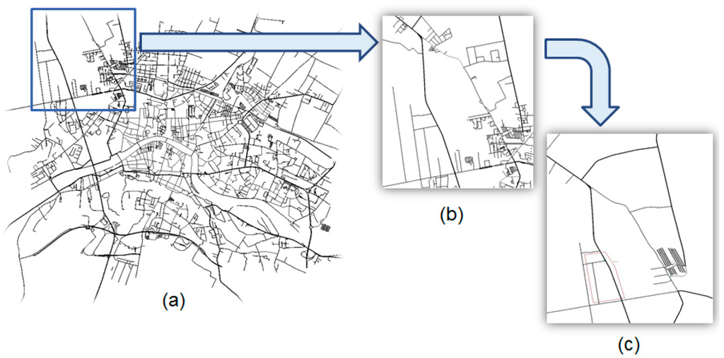 Map in SUMO used for the simulation: (a) Pisa city centre. In blue the selected area for the urban use cases simulation; (b) Zoom over the selected area, with a 350 slots parking facility; (c) Simplified model for the simulations, with the main road connections and the parking facility.