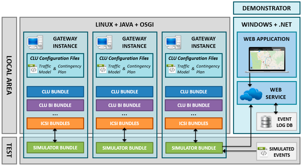 As can be seen in Figure 5, three GW instances are deployed. These instances are complete SW architecture implementations running in a GNU/Linux machine in three different processes. These processes communicate with each other via event messages. The CLU OSGi set of bundles and the needed configuration files are also included and running on each of the instances, so a complete Local Area is being simulated in the provided test environment.