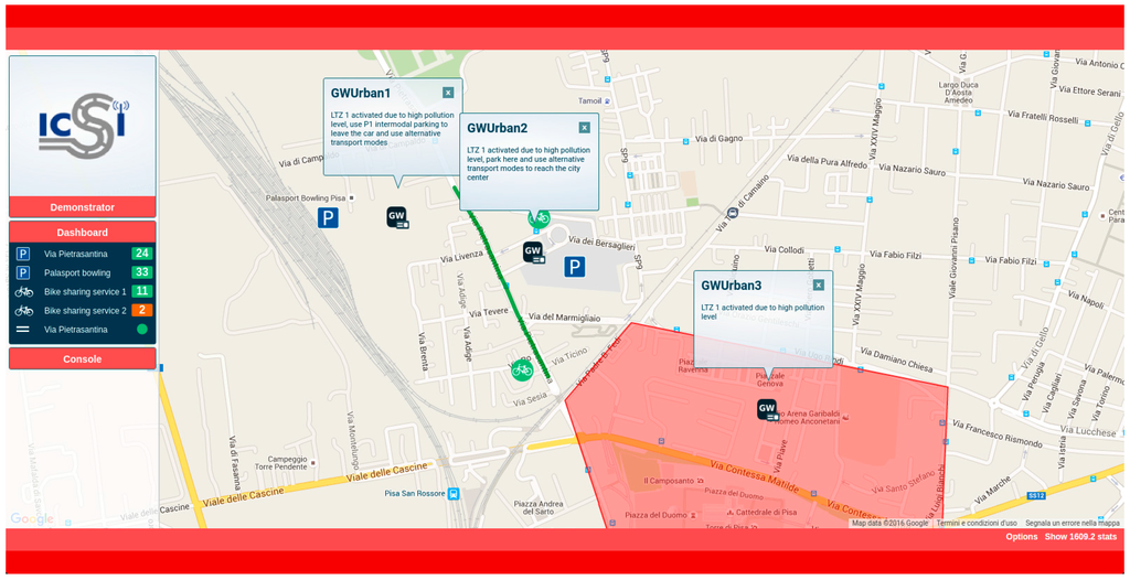 During the simulation, the system monitors the CO2 levels of the restricted area. When the system detects that these levels continue to rise, being probable that the maximum levels can be exceeded, the restricted area is closed. Once the restricted area is closed, only authorized vehicles are allowed to access it, while the rest of the vehicles must be re-routed. In addition, the Pietrasantina’s Parking has been defined in a way that the number of free slots is available for simulation purposes. This parking has more than 350 slots. With the aim of simulating intermodal applications, the bus station has been incorporated, carrying drivers from/to the Pisa city centre.