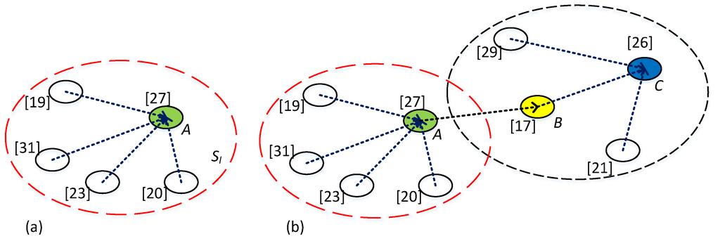 where is the sink node or a node in another sub-network, is the physical distance between node and node , and is the distance threshold of communication between two sensor nodes. From another perspective, if a sub-network satisfies Equation (2), will be considered as the kernel node of , and all other nodes in , named member node, can communicate with it. For example, in Figure 1a,b, Node A is a kernel node with 4 member nodes. In Figure 1b Node C is also a kernel node with 3 member nodes. If Node A and Node B are considered a sub-network, Node B is the kernel and Node A is the member node.