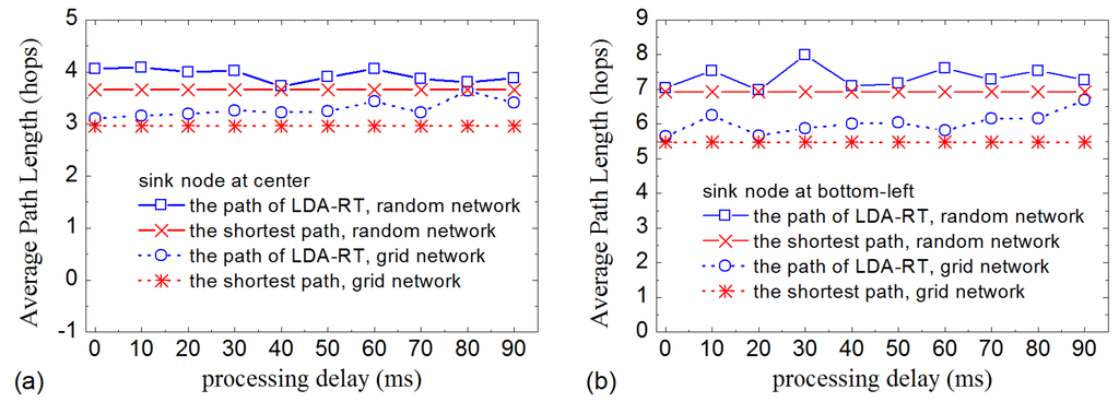 Average path length with different processing delays: (a) Base station located at the center; (b) Base station located at the bottom-left corner.