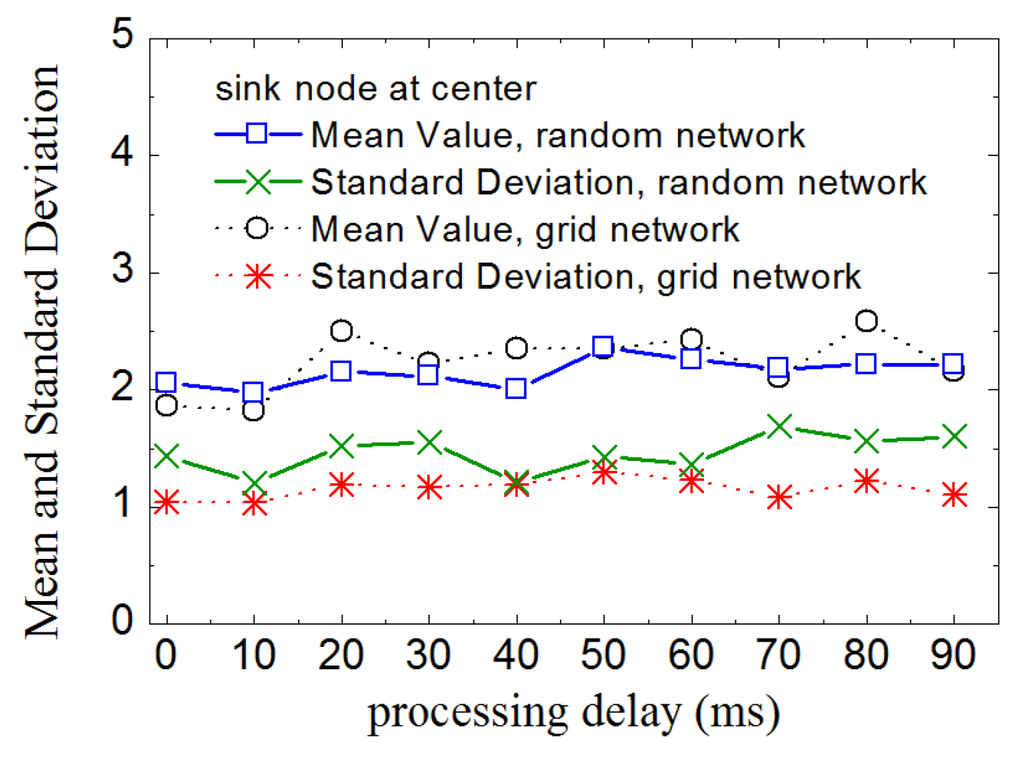 As described in Section 3, kernel nodes in a routing tree conduct data aggregation. So, it is likely to consume more energy than leaf-nodes. In general, the more children nodes that a kernel node has, the more energy it will consume. Even so, when LDA-RT aggregates data, the computations have low complexity and low cost. Therefore, if some kernel nodes have more children nodes than others, they will have an adverse effect on the lifetime of network. Thus, we investigate the number of children nodes of each kernel node in various routing trees with different processing delays. Figure 6 shows the results, in which mean value plots, with values ranging from 1.818 to 2.5 for grid network and from 2.0 to 2.37 for random network, show that processing delay does not have a significant effect on how many children nodes a kernel node has. In addition, under any condition of processing delay, the standard deviation of the number of children nodes is near 1 for grid network and 1.5 for random network, which means that the number of children of every kernel node tended to be close to the mean value. It can also be considered that the energy consumption of each kernel node tends to balance at data aggregation level. Un-uniform distribution of nodes is also the reason that the standard deviation is slightly larger in random network.