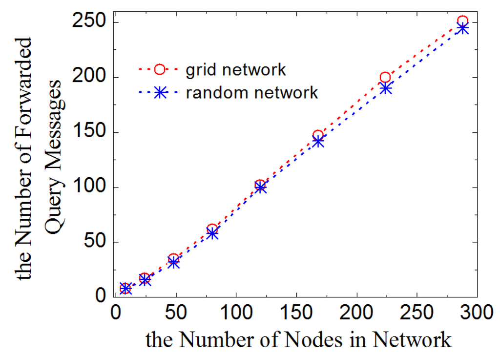 Another important value is the number of query messages forwarded in one query round in the entire network. Figure 8 shows the results in various sizes of networks excluding messages resent by leaf-nodes. The curve demonstrates that, in LDA-RT, the number of forwarded messages is essentially linear with respect to the number of nodes, which is in agreement with the fact that each node resends the query message only once.