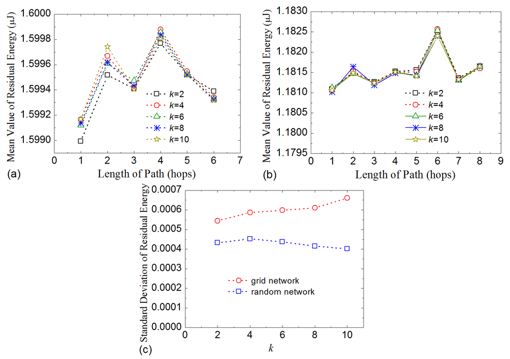 Figure 9a shows the mean values of residual energy of nodes in grid networks and Figure 9b in random networks. The results indicate that, when nodes’ paths have the same length, the nodes have approximately the same final residual energy values for different values of parameter k. For example, they lie in the range from 1.5995 to 1.5997 μJ for the nodes that have path lengths with the value of 2 in grid network. This indicates that energy consumption is balanced in horizontal direction of the routing tree. However, for a given k value, the length of path has no linear effect on the mean value of residual energy. This means energy consumption of nodes is balanced in the direction of routing path under microscope, which is very important for keeping the whole network alive, because the nodes close to base station would usually consume more energy. The fluctuations of values are the result of scale of assembled nodes. The results also indicated that there is no node runs out of energy any earlier than other nodes. Figure 9c shows the standard deviation of residual energy, which further demonstrates that LDA-RT performs well in terms of balancing the energy load. We can notice that random network has smaller standard deviation than grid network. The data details imply that nodes in random network change their kernel node more often, which makes more balanced power consumption.