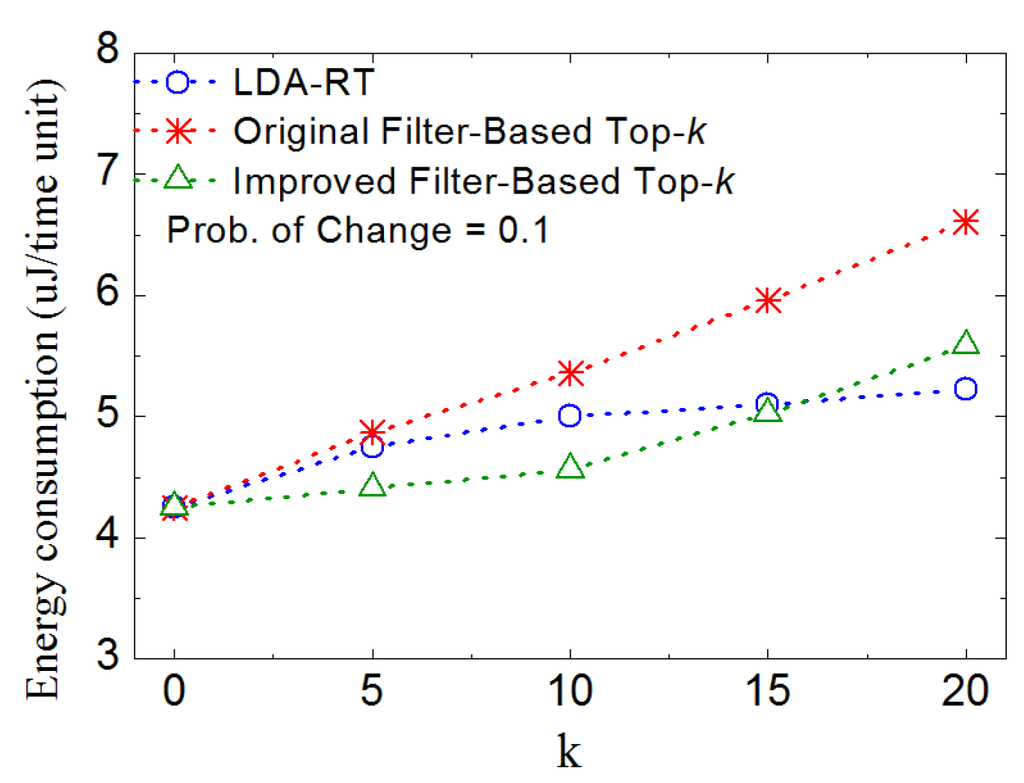Figure 12a shows the simulation results for energy consumption. It is reasonable that average energy consumption of the proposed LDA-RT approach is constant, because energy consumption is not related to the change of reading values in LDA-RT. To the contrary, the energy consumption of filter-based top- query approach increases as the number of nodes with changed values increases. This can be explained by the fact that increasing the number of changed values causes more frequently updating of windows. This procedure requires more energy on the shortest path tree. In our simulations, when there are four or less changed values, the average energy consumption of filter-based method is improved. However, when five or more values changed in a period, the LDA-RT approach outperformed the filter-based method. The detailed data also indicated that most of energy is consumed during sleeping time rather than by data transmission of. So, if the energy needed to transmit data increases, the curve of filter-based method will increase at a greater rate. It means filter-based method will perform even better than LDA-RT with fewer changes and worse as the number of changed values increases.