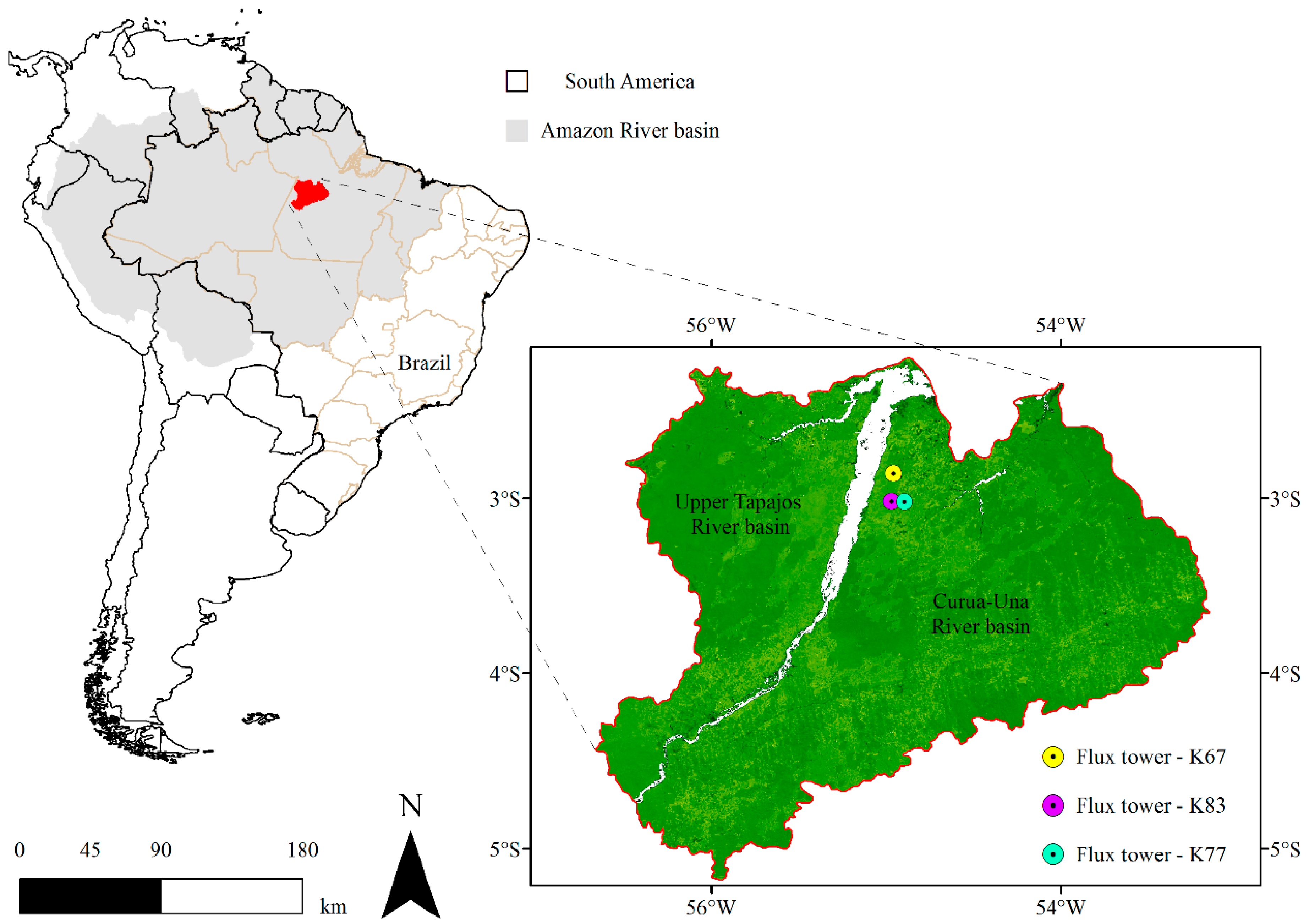 Three eddy covariance flux towers sites of the LBA project (K67, K83 and K77) were used in this study (Figure 1). The sites are located in the municipality of Belterra, near the confluence of the Tapajos and Amazon rivers, at an average elevation of 130 m. K67 (2.86° S, 54.96° W) and K83 (3.02° S, 54.97° W) are forest experimental sites. K67 is in an undisturbed primary forest [43]. At the K83 site trees with diameter at breast height greater than 35 cm were selectively logged during three months beginning in September 2001 [44]. These sites have canopies with a mean height of ~35–40 m. The flux towers in K67 and K83 are 63 m and 64 m tall, respectively [45]. K77 (3.02° S, 54.90° W) is in a previously forested area that had been converted to pasture. The primary forest was cleared in 1990 and the field was then planted with grass. In November 2001 the site was prepared for rice cultivation. The rice was harvested in June 2002 and the field was not replanted [46]. The mean canopy height at K77 is of ~0–0.6 m and flux measurements are made on a 18 m tower [45]. Additional information about K67, K83, and K77 sites can be found in Gonçalves et al. [17], Saleska et al. [39], Rice et al. [47], and Miller et al. [48].