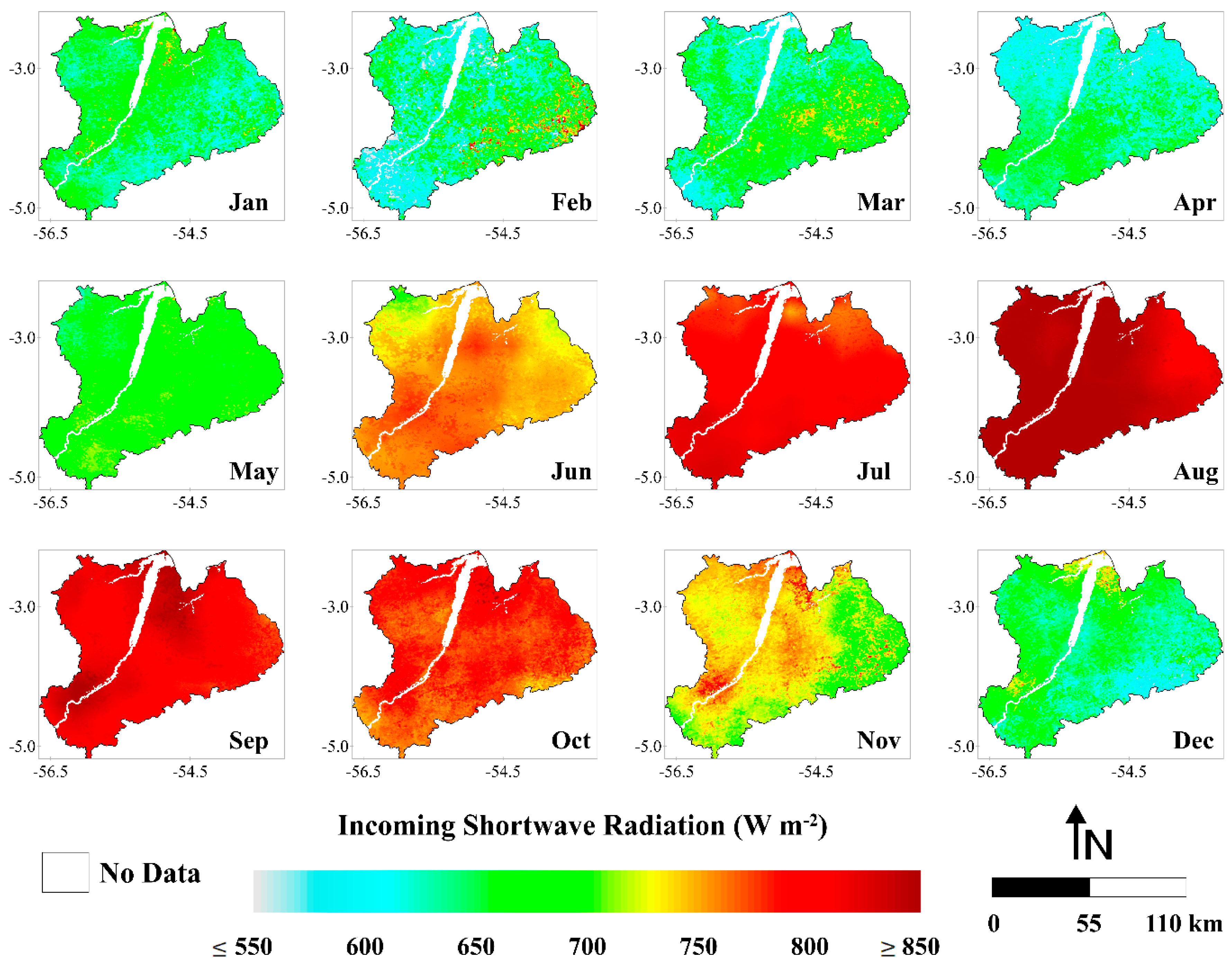 Monthly averages of incoming shortwave radiation (W·m−2) (months of January (Jan), February (Feb), March (Mar), April (Apr), May (May), June (Jun), July (Jul), August (Aug), September (Sep), October (Oct), November (Nov) and December (Dec)), between the years 2001 and 2006, in the Upper Tapajos and Curua-Una River basins.