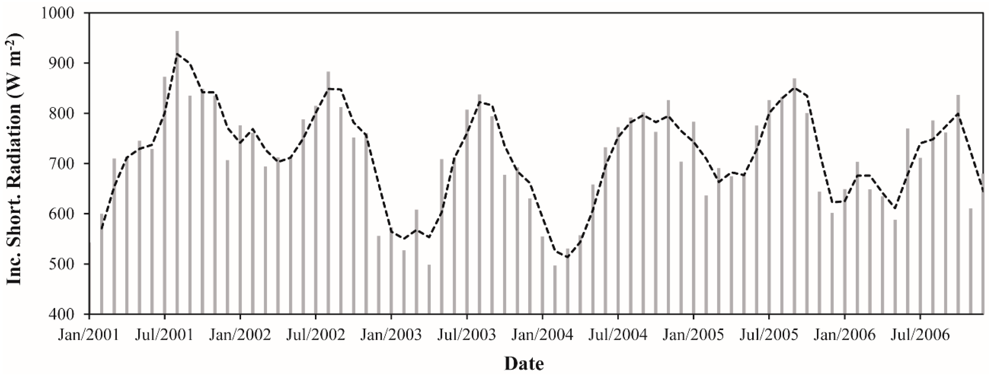 Monthly incoming shortwave radiation between January 2001 and December 2006 in the Upper Tapajos and Curua-Una River basins. The dashed black line represents the moving average of time series (period = 2).