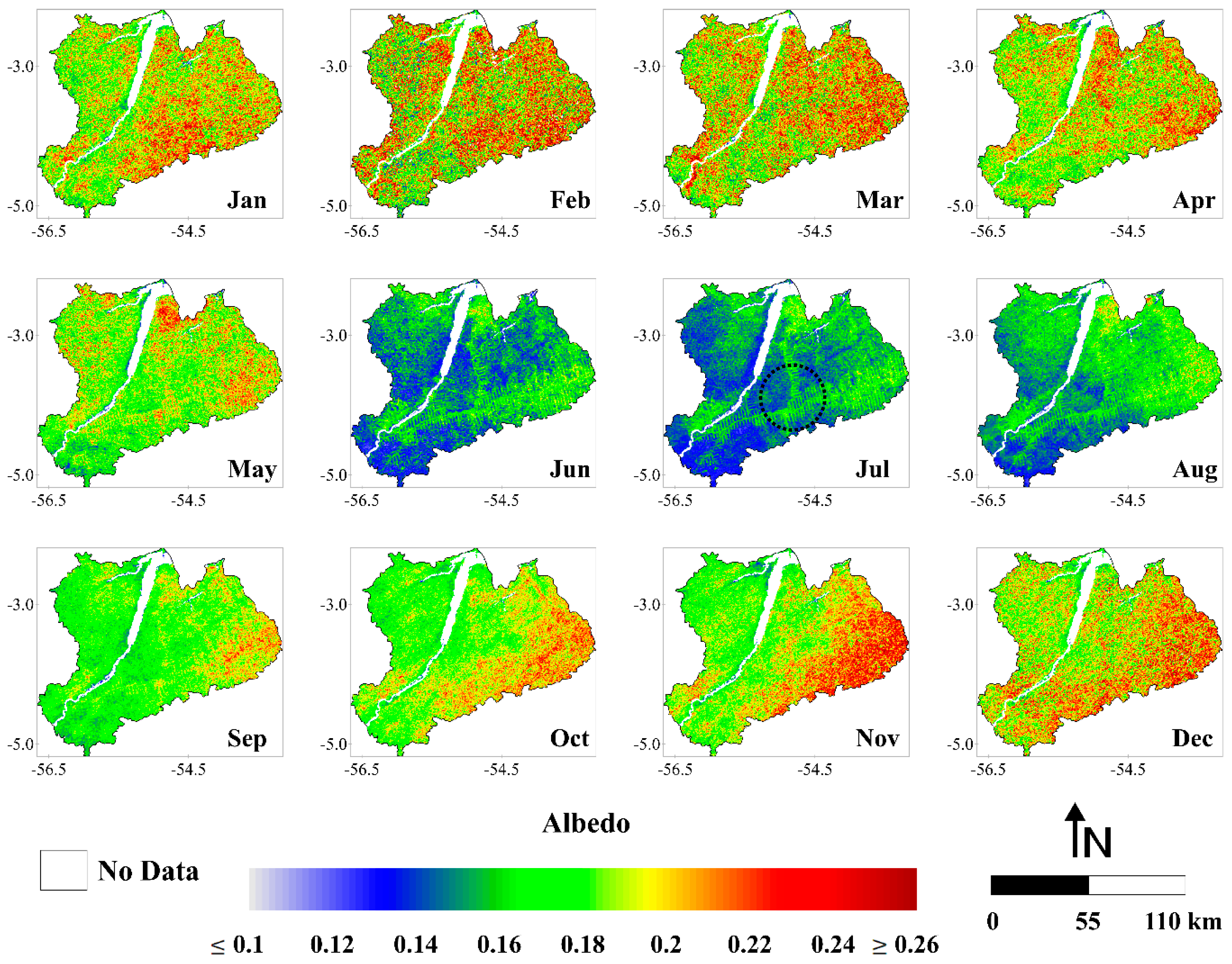 The images with the highest values of albedo corresponded to the months from October to May (Figure 4). These images presented values generally ≥0.18 while the maps of June, July, August and September showed values typically ≤0.16. As can be noted, there is a decrease in albedo in the early dry season. Local-scale studies developed in Amazonia have been shown the highest albedo values generally occurring at the same time as the driest soil moisture conditions (dry season) [14,71]. Although the results here are different, we justify this behavior by the high increase of solar radiation reaching the earth surface in this region at this time of the year. That is, the decrease in surface moisture, which can causes a lower absorption of solar radiation (and consequently a higher albedo), is cancelled by a large increase in incoming shortwave radiation, resulting in a reduction of albedo. It is interesting to note that in most images, the highest values of albedo are located in the eastern part of the study area, more precisely in the Curua-Una River basin. It can be clearly seen between June and December. This area is situated within the so-called arc of deforestation, which is under higher pressure from human settlement and where the deforestation actually occurs [72]. We can also observe in the black dashed circle over the image of July the spatial pattern of deforestation in the Amazon, known as the fish spine [73]. In this regard, it is possible to verify the difference of albedo values between logged and forested areas, with the later presenting lower values. Because they are darker, forests absorb more solar radiation than short vegetation, having thus a smaller albedo [74,75,76,77].