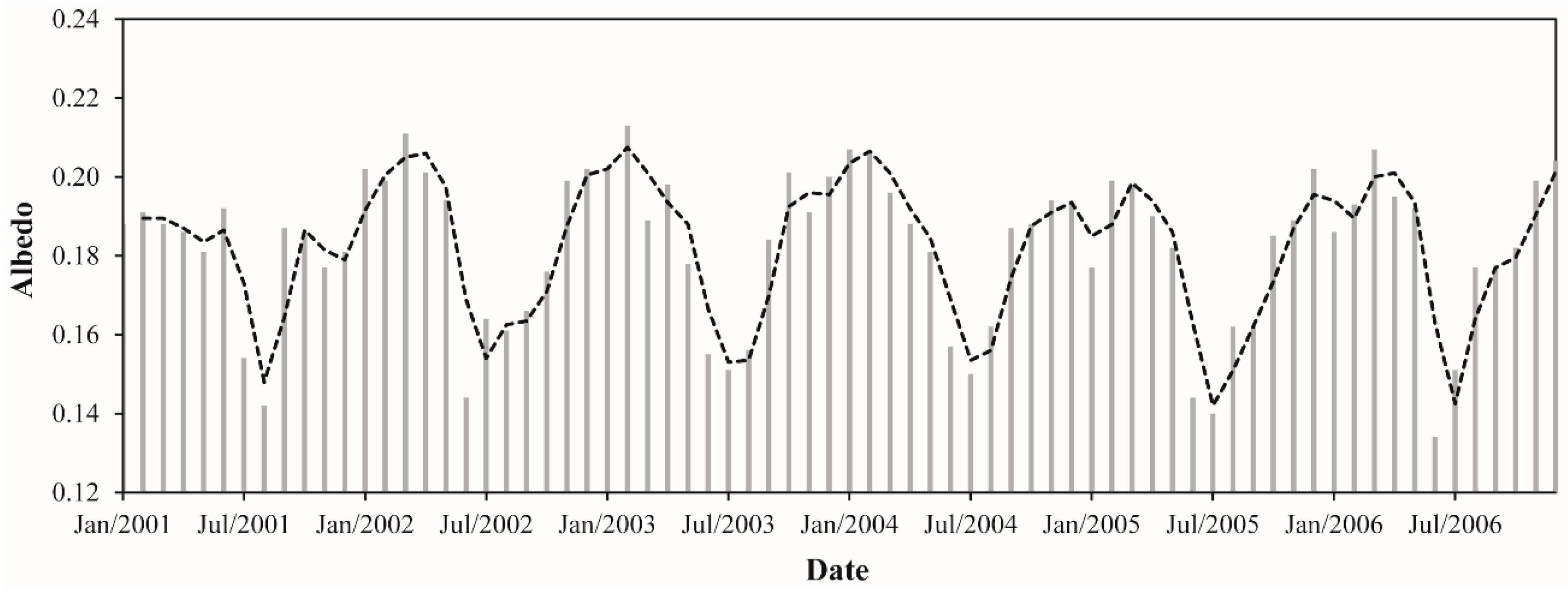 The monthly albedo values ranged from 0.134 to 0.213, a relative difference of ~59%. These values were observed in June 2006 and February 2003, respectively (Figure 5). Considering the average between 2001 and 2006, the monthly albedo corresponded to 0.182. Regarding the monthly average, July and February were the months with lowest (0.152) and highest (0.20) albedo values, respectively. Also, the monthly average albedo is ~5% lower in the dry season compared with the wet season. For the dry season, the monthly average albedo was 0.177 while in the wet season was 0.187. The annual average albedo values varied between 0.178 (2005) and 0.185 (2002 and 2003), constituting an absolute difference of 0.007 (~4%). This result evidence a small interannual variation of albedo in the eastern flank of Amazonia.