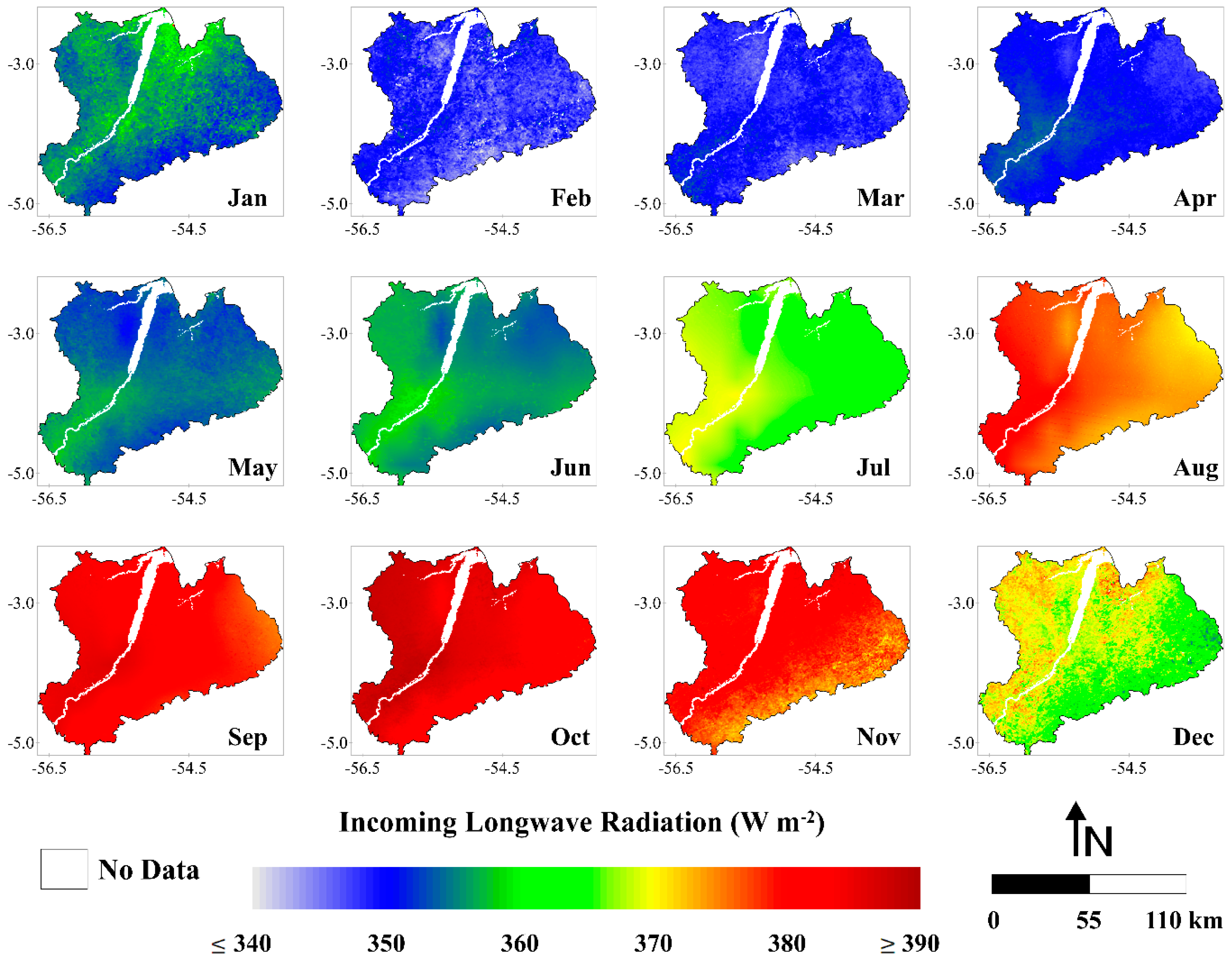 Monthly averages of incoming longwave radiation (W·m−2) (months of January (Jan), February (Feb), March (Mar), April (Apr), May (May), June (Jun), July (Jul), August (Aug), September (Sep), October (Oct), November (Nov) and December (Dec)), between the years 2001 and 2006, in the Upper Tapajos and Curua-Una River basins.