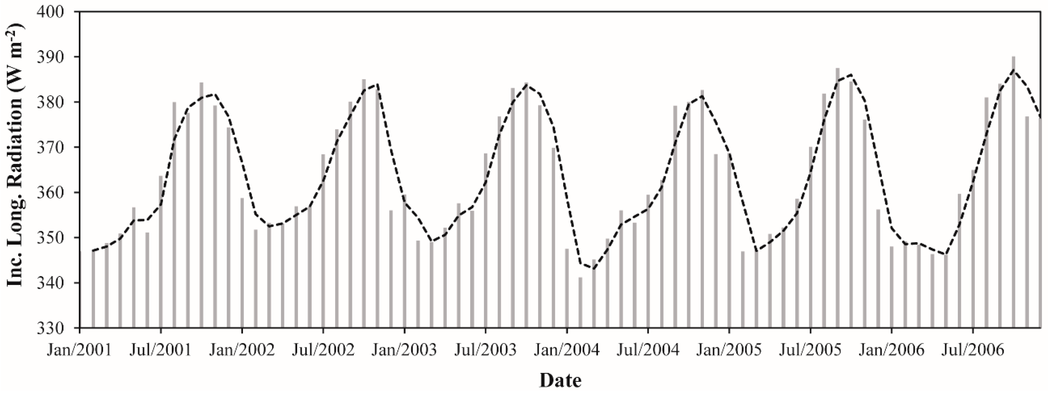 The monthly L↓ ranged from 341.2 W·m−2 (February 2004) to 390.1 W·m−2 (October 2006), representing an absolute difference of 48.9 W·m−2 (~14%) (Figure 7). The average monthly L↓ for the whole period was 363.9 W·m−2. The lowest and highest values of monthly average L↓ happened in the beginning of the dry season (February) and late wet season (October) and corresponded to 347.6 and 384.7 W·m−2, respectively. The monthly average L↓ in in the wet season was 352.0 W·m−2 while in the dry season was 375.8 W·m−2. This result shows an increase in L↓ during the dry season of ~7%. The annual average L↓ values varied between 360.5 and 365.5 W·m−2, revealing a relative difference of only 1%. The years of 2004 and 2003 presented the lowest and highest values of L↓, respectively.