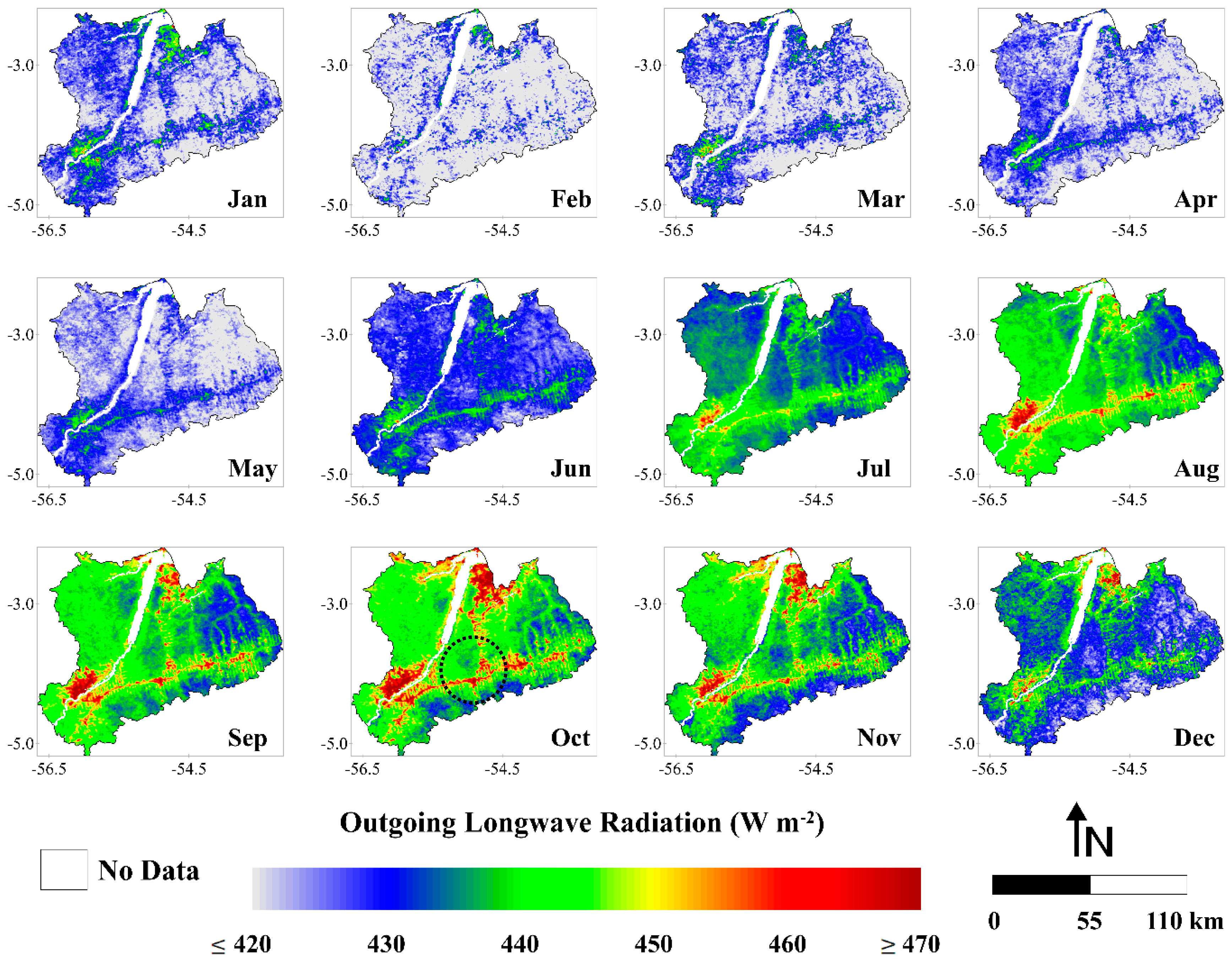 The spatial pattern of L↑ reveals that the eastern portion of the study area has the highest emission of longwave radiation from the surface (Figure 8). As we discussed in Section 3.1.2, this region is strongly affected by deforestation. The conversion from forest to pasture or agricultural areas increases the surface temperature and alters the emissivity, resulting in an increase in L↑ [78,79]. The fish spine pattern is clearly observed in the images from July to December (black dashed circle over the image of October). The images with the highest values of L↑ corresponded to the months from July to December (dry season), following the pattern observed for L↓ in Section 3.1.3. These images presented values generally ≥450 W·m−2 while the images of wet season (January to June) showed values generally ≤430 W·m−2. The estimation of L↑, similarly of L↓, was obtained through Stefan-Boltzmann law (described in Section 2.5). The primary difference in the estimation relies on the use of surface temperature instead of the atmospheric temperature. The MODIS surface temperature in the study area increased in the dry season about 2.4 °C relative to the wet season, justifying the increment in L↑ during this time of the year.