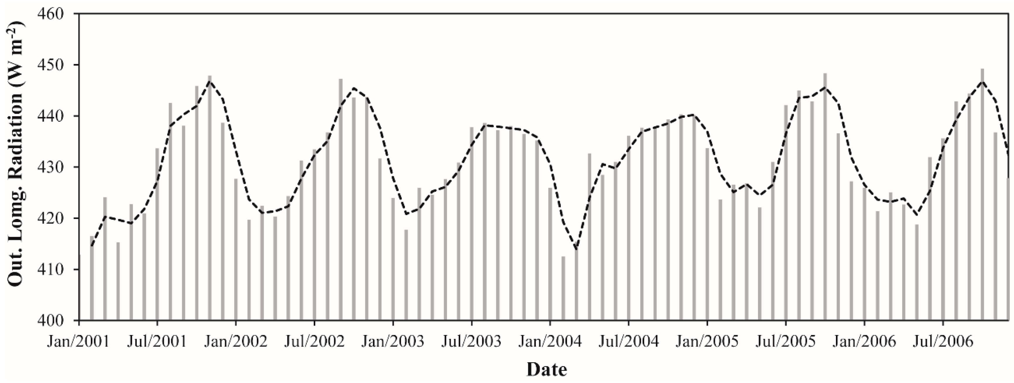 The monthly L↑ ranged between 412.5 and 449.2 W·m−2, representing an absolute difference of 36.7 W·m−2 (~9%) (Figure 9). These values were observed in February 2004 and October 2006, respectively. It is important to note that, as expected, the minimum and maximum values of L↓ were also found in February 2004 and October 2006, respectively. Considering the average during whole study period, we observed a monthly L↑ of 431.7 W·m−2. In terms of the monthly average, February and October showed the lowest (418.6 W·m−2) and highest values (444.0 W·m−2), respectively. A monthly average L↑ ~4% higher in the dry season in comparison with the wet season was also observed. For the wet season, the monthly average L↑ was 424.0 W·m−2 while in the dry season was 439.3 W·m−2. The annual average L↑ values varied between 429.9 W·m−2 (2001) and 433.8 W·m−2 (2005). It constitutes a variation of ~1%, the same verified for L↓ in the Section 3.1.3. These results demonstrate a very small interannual fluctuation in the longwave radiation components over the Upper Tapajos and Curua-Una River basins.