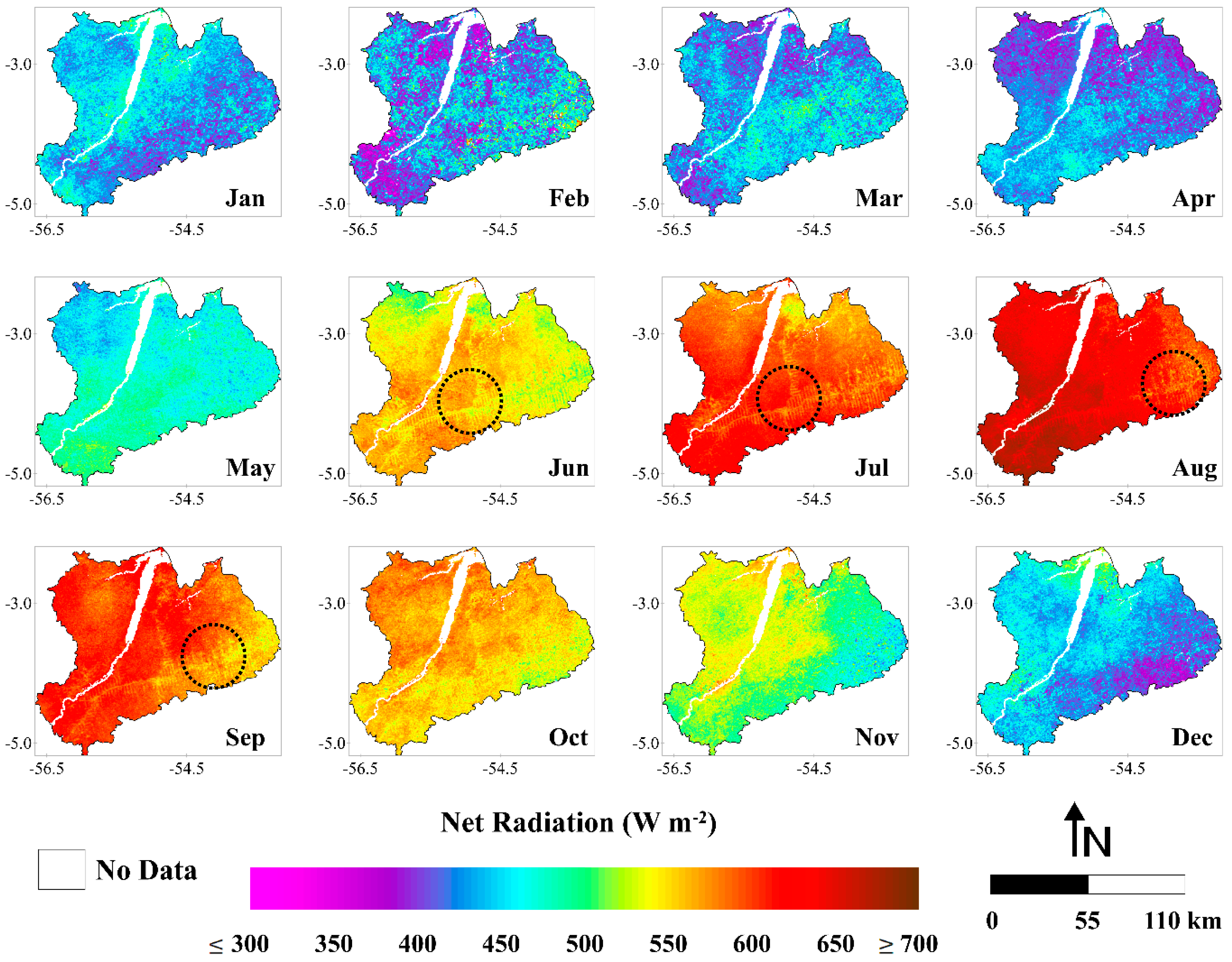 The highest values of Rn are shown to be situated in the western part of the study area (Figure 10). As discussed before, this area is better preserved in terms of deforestation. Rn over forest areas is higher than in pasture areas, due to differences in the outgoing solar radiation (albedo) and in the longwave radiation balance [75,80]. In the images of June, July, August and September is possible to verify the fish spine pattern (black dashed circles), also clearly observed in the albedo images (Section 3.1.2) and L↑ (Section 3.1.4). This data shows that logged areas, mostly of which were converted posteriorly to pasture, present higher albedo and L↑ and lower Rn, compared to forested areas. This result is in agreement with various observational studies in the Amazon [3,65,81,82].