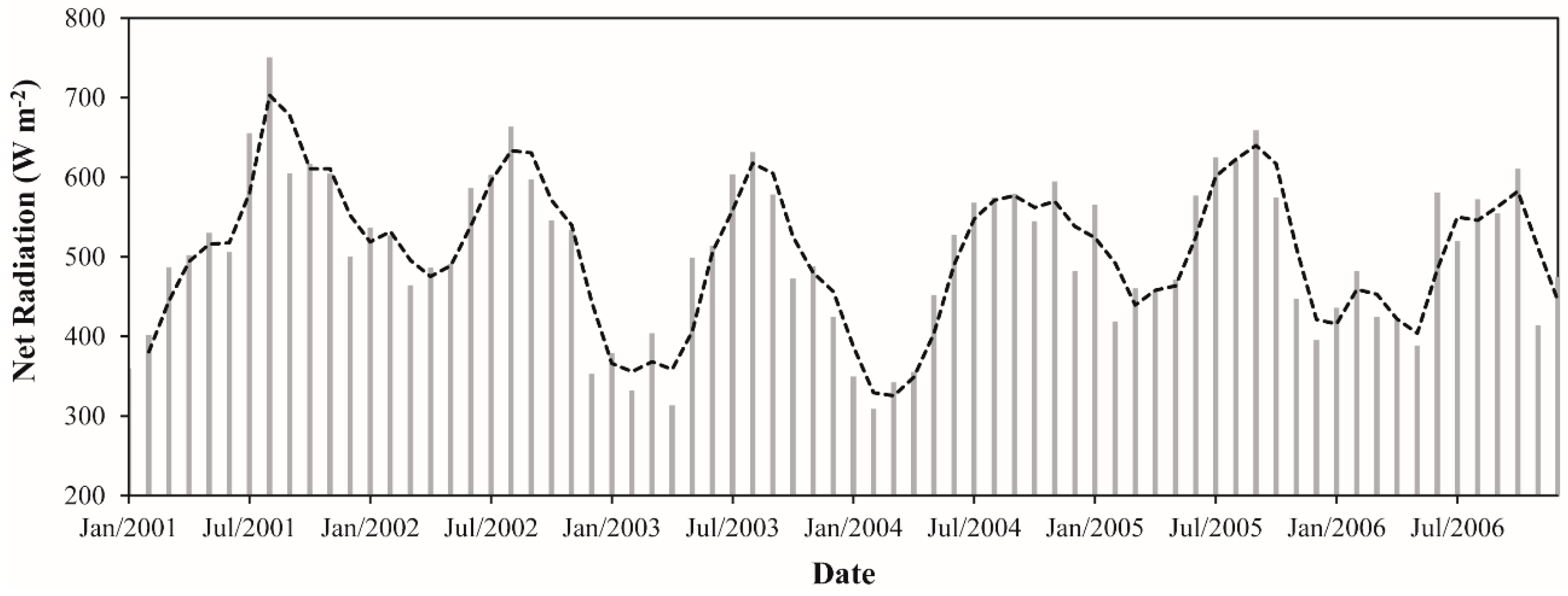 Monthly net radiation between January 2001 and December 2006 in the Upper Tapajos and Curua-Una River basins. The dashed black line represents the moving average of time series (period = 2).