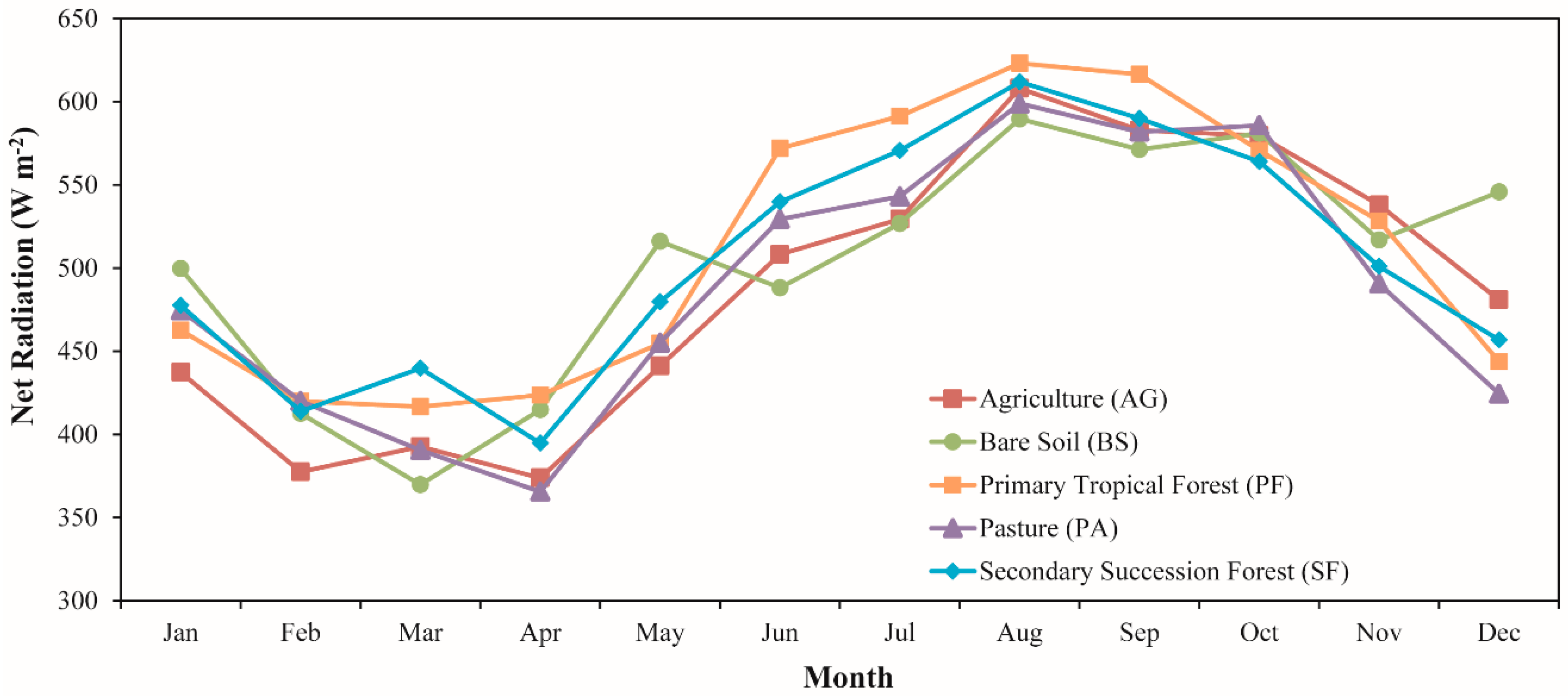 Seasonal patterns of net radiation under agriculture (AG), bare soil (BS), primary tropical forest (PF), pasture and secondary succession forest (SF). The monthly average was calculated based on the period between 2001 and 2006.