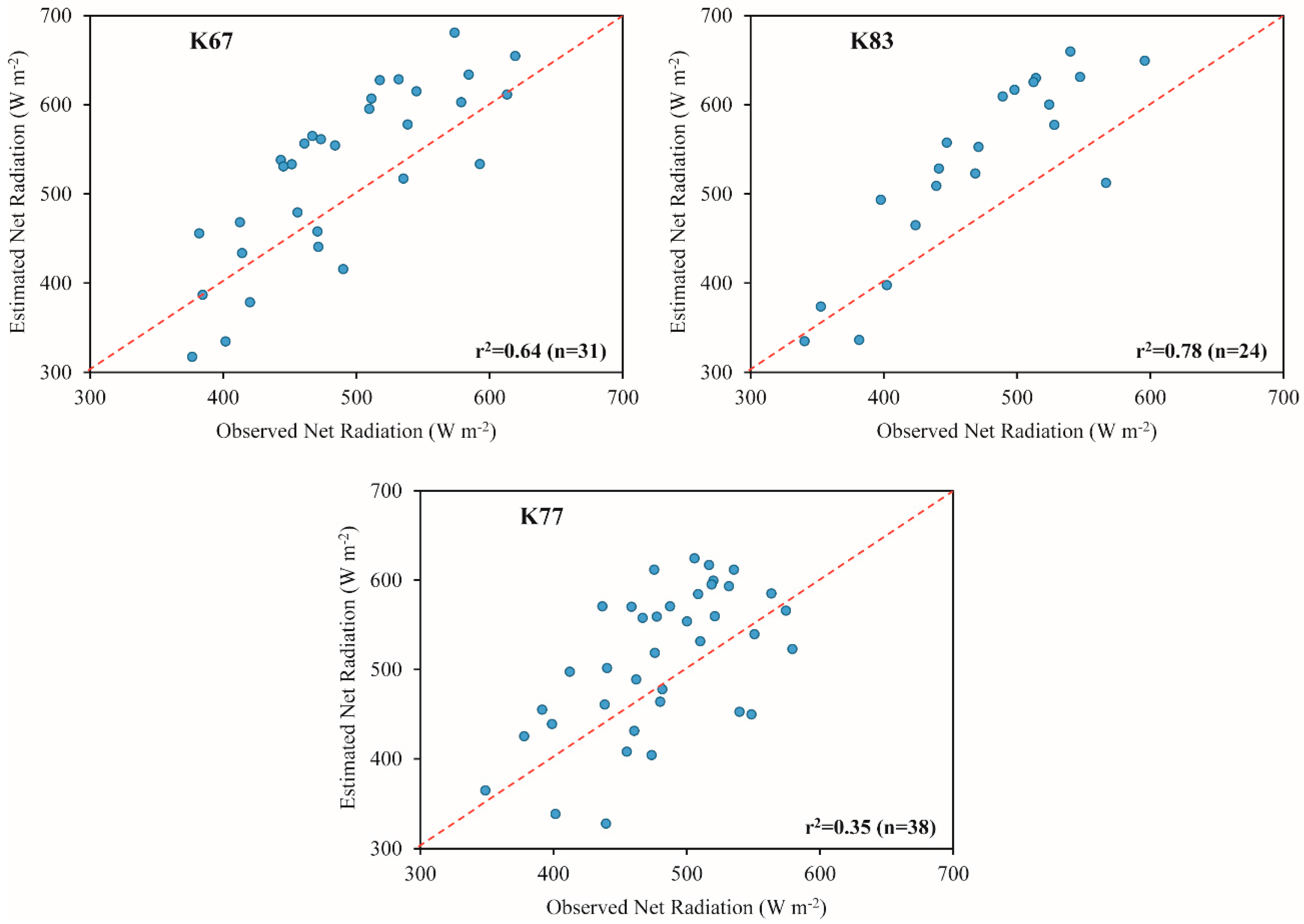 The surface radiation budget estimates and reanalysis data were compared with LBA flux tower measurements to evaluate the performance of our approach. The estimated values were extracted from one pixel (1 km × 1 km) centered on each flux tower (K67, K83 and K77) [61]. It is important to highlight that K67, K83 and K77 sites comprise the conditions of primary tropical forest, secondary succession forest and agriculture, respectively. These represent the most important terrestrial ecosystems in the Amazon. Therefore, we assume that they can represent the average environmental conditions of the study area. Four indices, including the correlation coefficient (r2), bias (Equation (12)), root mean square error (RMSE) (Equation (13)) and mean relative error (MRE) (Equation (14)), were used to assess the accuracy of the estimations: