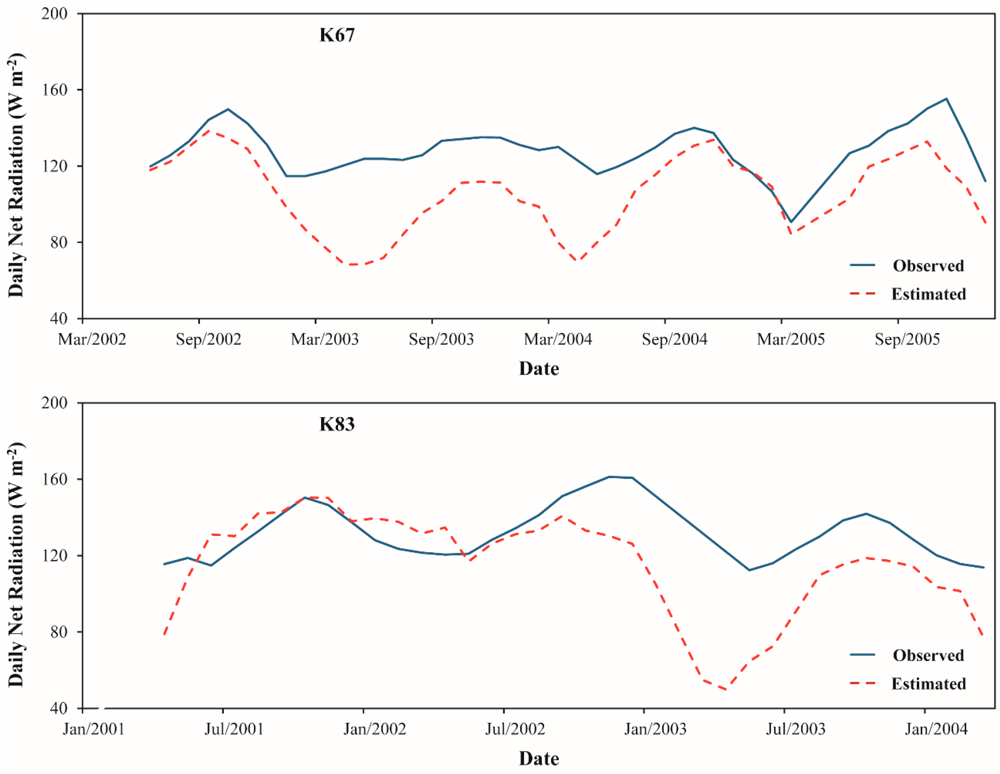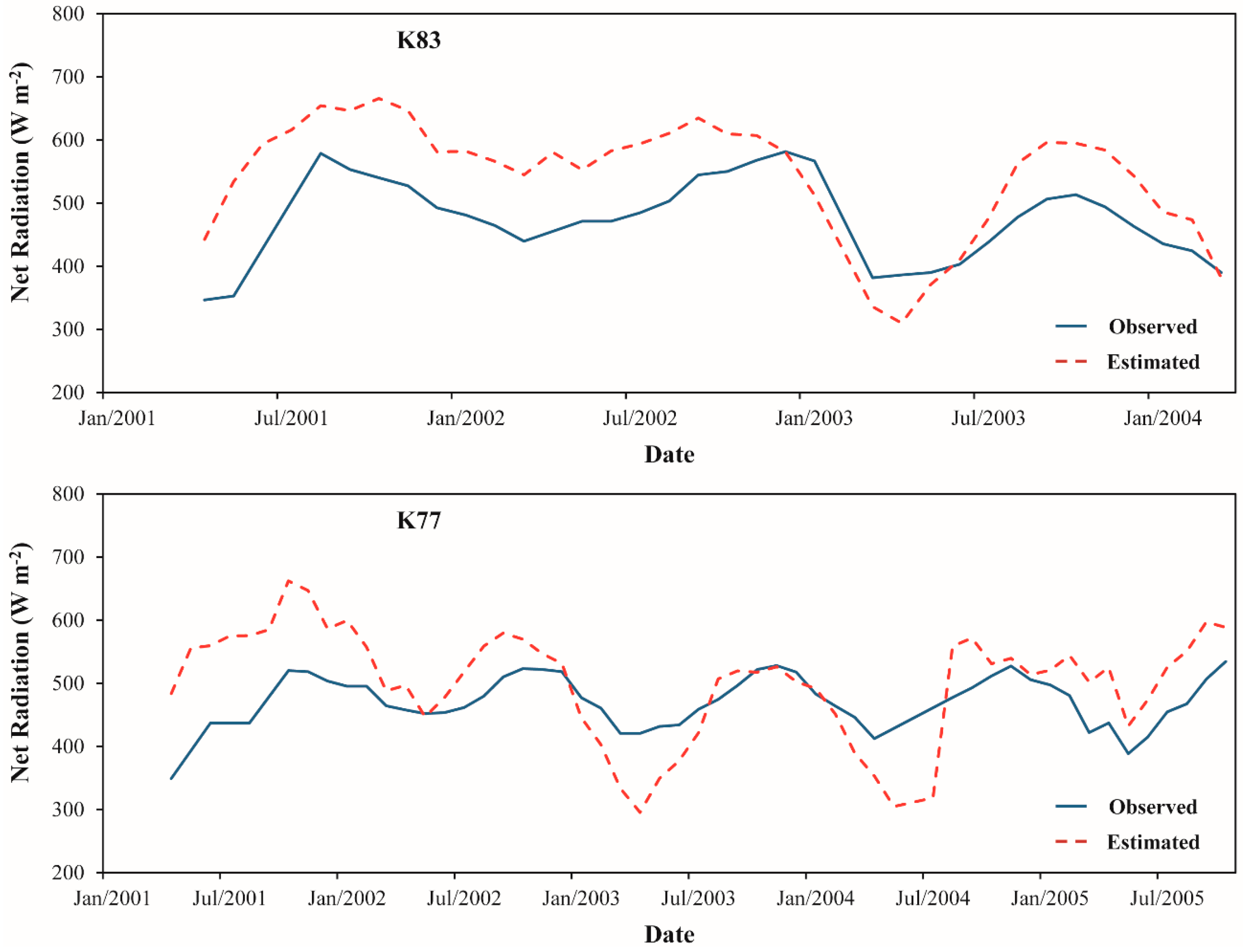 The MRE in the incoming shortwave radiation was approximately 10%–11% of the field measurements (Table 1). The bias varied from 45.7 to 70.5 W·m−2, while the RMSE ranged from 72.7 to 86.5 W·m−2. Baik and Choi [62], comparing K↓ obtained from satellite images and ground data, observed biases and RMSE varying between −21.6 to −112.6 W·m−2 and 107.1 to 202.4 W·m−2, respectively. The average r2 was 0.82, oscillating between 0.78 and 0.86 in K77 and K83 sites respectively. In a study developed by Shi and Liang [31] to analyze K↓ acquired from four different reanalysis datasets, it was found r2 values varying between 0.42 and 0.47. In respect to daily incoming shortwave radiation, considering the two sites, the MRE was about 17%. The bias and RMSE values were of the order of 25.4 to 36.5 W·m−2, and 32.2 to 41.2 W·m−2, respectively. In a daily basis, Hou et al. [9], observed biases and RMSE ranging from 21 to 25 W·m−2 and 27 to 28 W·m−2, respectively. The average r2 value verified in our study was 0.76 while Hou et al. [9] observed a value of 0.98. In general, considering the incoming shortwave radiation (both instantaneous and daily) it is important to note that the values tend to be overestimated in comparison of ground data. Also, it is verified that the results were more accurate for the pasture (K77) than the forest site (K83).