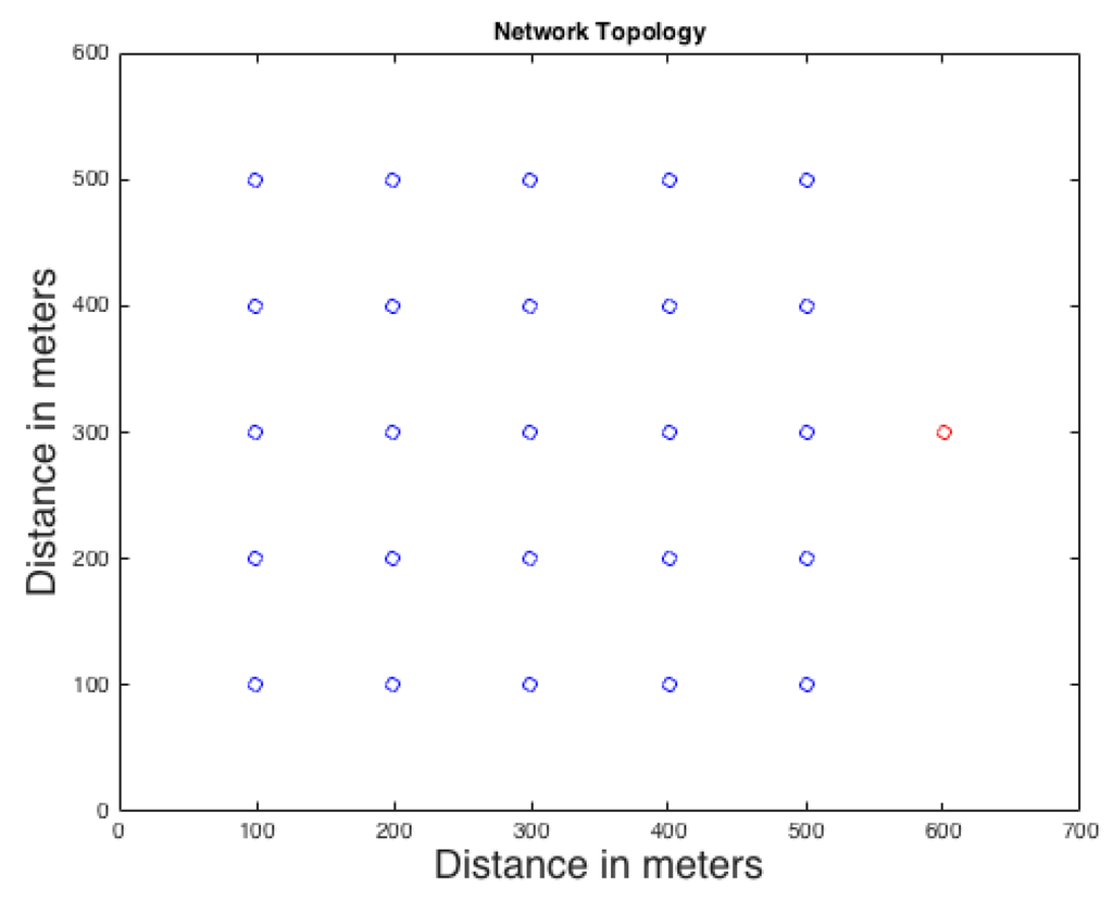 Network topology: blue nodes are regular sensors and the red node is the sink.