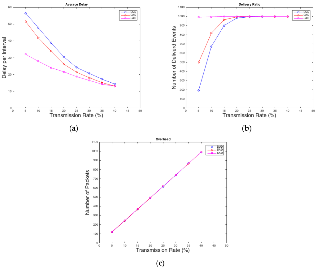 As shown in Figure 3a CAD performs much better in terms of average delay than DAD especially in low rates, which is desired by most of the applications. In case of average delay, DUD is the worst as expected, because it does not have any mechanism to improve the delay of real packets as the other two techniques. Also in terms of delivery ratio, as shown in Figure 3b, CAD is the best and it has an advantage over the other two techniques because it forces the packet of a real event to be sent after a specific waiting time, which is 5 intervals in this experiment. Moreover, DAD is still performing better than DUD since real packets have higher probability to be sent than the dummy ones. Meanwhile, the overhead traffic in Figure 3c is almost the same for all three techniques, because the total number of packets stays the same for all techniques. Thus, it is concluded that CAD and DAD reduce the average delay and increase the delivery ratio without gaining additional overhead.