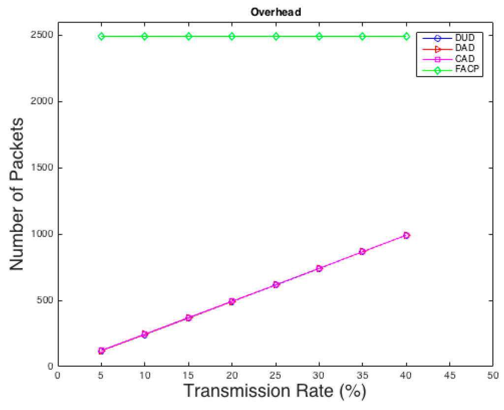 Another comparison is conducted between our techniques and the technique used in [15] in terms of overhead. As shown in Figure 4, our techniques reduce the overhead rapidly compared to the FACP, technique especially in low rates. This is because DUD, DAD, and CAD are probability-based techniques. They create fake traffic based on probability instead of sending dummy packets every single interval like FACP which causes unnecessary overhead. Most of the anonymity applications in WSNs will require low fake rates to reduce overhead to maximize the lifetime of the network.