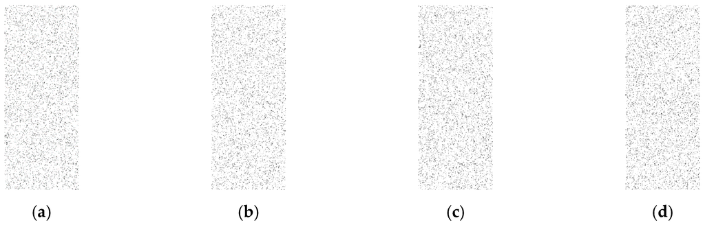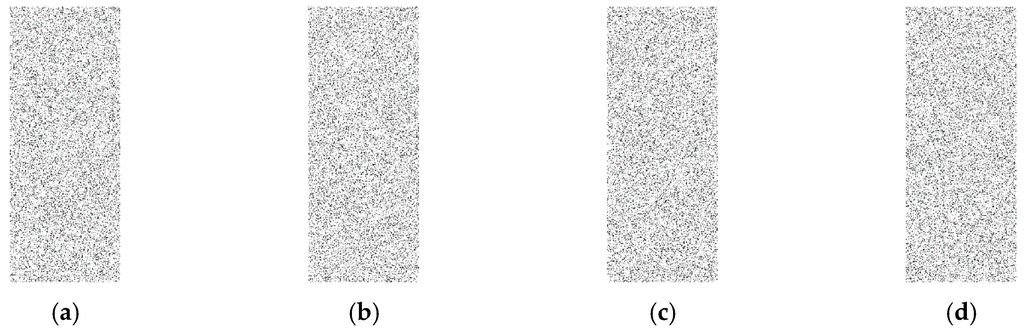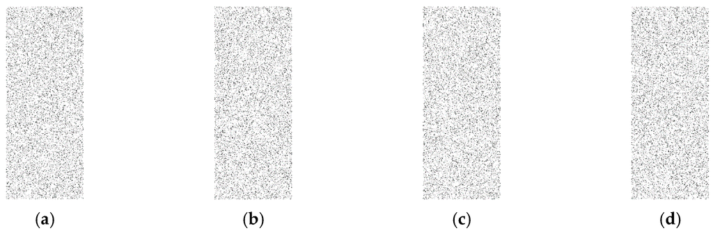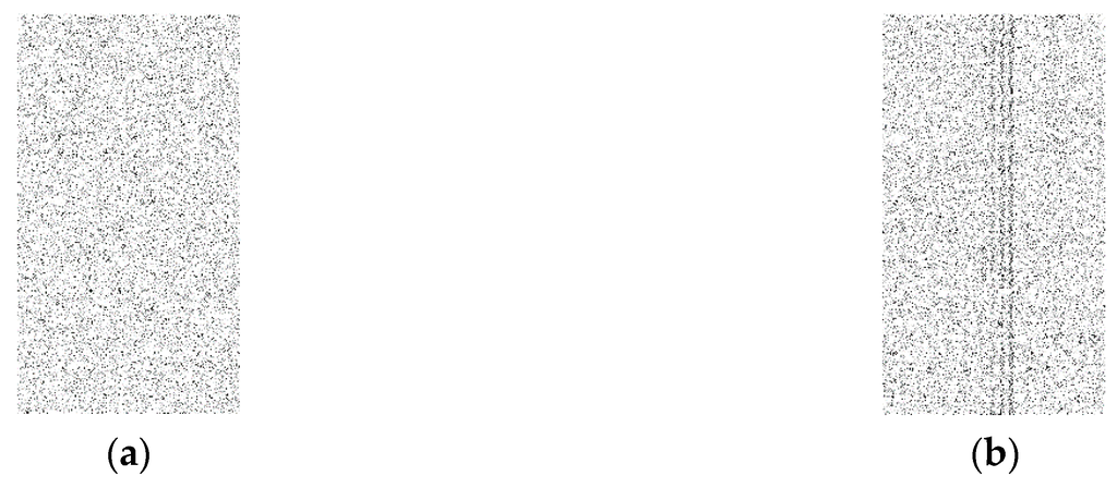 In this approach, the output data, which is represented as a binary matrix, is converted to a binary image. In order to convert the binary matrix into a binary image, ones are represented as black pixels and zeroes as white pixels to make the image visualization better at low rates. The goal here is to check if there is any kind of visible pattern inside the image such as a set of black pixels that look like a row or a column as in Figure 5b, which indicates a real event exists. This is called a weak technique, which refers to any technique that provides a binary matrix that is not random and can be very easily distinguishable from a complete random binary matrix Figure 5a. However, if there is no visible pattern and the image looks completely random, the adversary will not be able to differentiate if a real event exists. In our testing, one thousand random simulation scenarios are created and converted into one image and compared to the images generated by proposed approaches to check if there is any kind of pattern. Different rates of 0.05, 0.1, and 0.15 are evaluated to examine the performance of the proposed techniques.