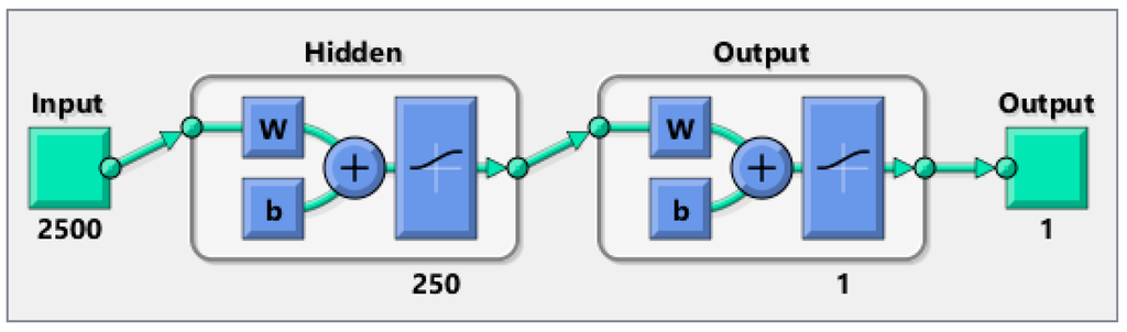 Another way to prove that the proposed solutions provide a high level of anonymity is to create a neural network and train it on many of the patterns (1, 0 matrix) produced by the different techniques. Then, feed an unknown simulation data to the trained network to see if it can detect the occurrence of an event. We compared each approach with the random matrix to see if the neural network is able to recognize the difference or not. If the network can distinguish the difference, this would mean that our solutions have a security flaw. Otherwise, they provide a high level of anonymity. We used two thousand random scenarios as the training input of the neural network. One thousand cases are random scenarios and the other one thousand cases represent one of our solutions (three techniques). The WSN used has 25 nodes and 100 intervals, so 2500 inputs are fed to the neural network. W is the weights that are generated by the neural network. At the beginning, those weights are selected randomly, then their values are changed using an algorithm called gradient descent. The aim of the neural network is to find the best weights combination that minimizes the errors between the neural network output and expected output, whereas b is just a constant. A graphical representation of the neural network is shown in Figure 9.