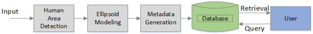 A multiple camera-based surveillance system must be able to retrieve the same object in different scenes using an appropriate query. However, non-normalized object information results in retrieval errors. In order to normalize the object information, we estimate camera parameters using automatic scene calibration and then estimate a projective matrix using camera parameters obtained by scene calibration. After obtaining normalized information, the object in the two-dimensional (2D) image is projected to a 3D world coordinate using the projection matrix. Existing camera calibration methods commonly use a special calibration pattern [], which extracts feature points from a planar pattern board and then estimates the camera parameters using a closed-form solution. However, the special calibration pattern-based algorithm has a limitation because the manual calibration of multiple cameras at the same time is impractical and inaccurate. In order to solve this problem, we present a multiple ellipsoid-based 3D human model using the perspective property of 2D images, and the block diagram of the proposed method is shown in Figure 1.