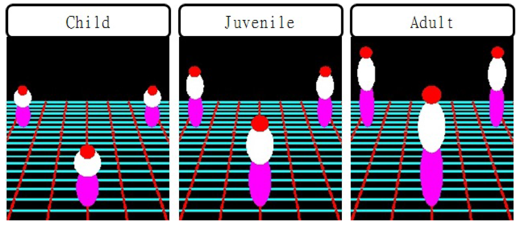 where , , respectively, represent the ellipsoid matrices of head, torso and leg. , and respectively represent the radii of ellipsoids in X, Y and Z coordinates and the center of the ellipsoids. To fit the model to real humans, we set the average heights of children, juveniles and adults as 100 cm, 140 cm and 180 cm, respectively. The ratio of the head, torso and leg is set to 2:4:4.