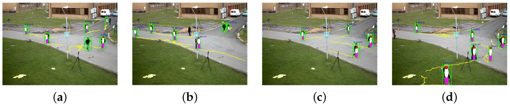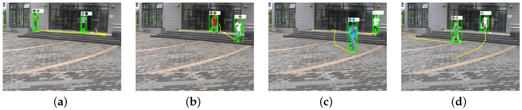 Results of the proposed algorithm using a public dataset []: (a–d) four frames in the test video with re-identified people.