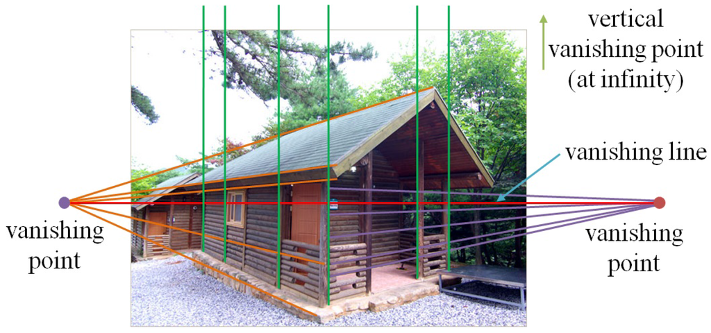 In the Euclidean geometry, two parallel lines do not meet anywhere. On the other hand, in the projective geometry, two parallel lines meet at a point called the vanishing point. A line connecting two vanishing points is called the vanishing line, as shown in Figure 4.