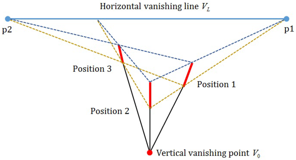 Existing single image-based methods to estimate vanishing points and lines often fail if there are no line components in the background image [,]. In order to overcome the limit of background generation-based methods, a foreground object-based vanishing point detection method was recently proposed [,,]. Since a general surveillance system has a camera installed at a higher position than the ground to view down objects, foot-to-head lines of a standing person at various positions on the ground, which is equivalent to the plane in the world coordinate, converge to a single point below the ground plane, as shown in Figure 5, where each position of the person is represented by a line segment with the bottom foot and the top head points. Extended foot-to-head lines meet at the vertical vanishing point below the ground level. The line connecting head points of Positions 1 and 2 meets another line connecting foot points of the same positions at p1. Likewise, p2 is determined by Positions 1 and 3. Based on the observation, three non-collinear positions of the person determine the horizontal vanishing line and the vertical vanishing point .