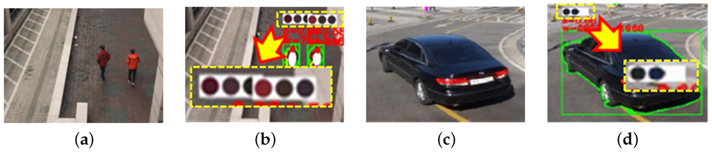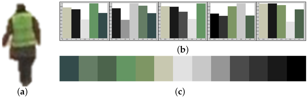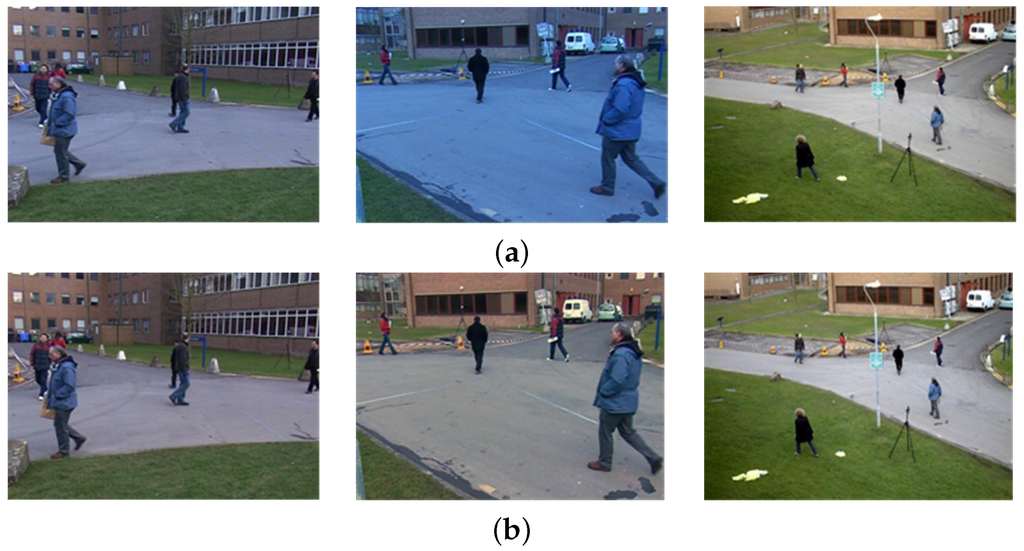 Hampapur et al. proposed a real-time video search system using video parsing, metadata descriptors and the corresponding query mechanism []. Yuk et al. proposed an object-based video indexing and retrieval system based on object features’ similarity using motion segmentation []. Hu et al. proposed a video retrieval method for semantic-based surveillance by tracking clusters under a hierarchical framework []. Hu’s retrieval method works with various queries, such as keywords-based, multiple object and sketch-based queries. Le et al. combined recognized video contents with visual words for surveillance video indexing and retrieval []. Ma et al. presented a multiple-trajectory indexing and retrieval system using multilinear algebraic structures in a reduced-dimensional space []. Choe et al. proposed a robust retrieval and fast searching method based on a spatio-temporal graph, sub-graph indexing and Hadoop implementation []. Thornton et al. extended an existing indexing algorithm in crowded scenes using face-level information []. Ge et al. detected and tracked multiple pedestrians using sociological models to generate the trajectory data for video feature indexing []. Yun et al. presented a visual surveillance briefing system based on event features, such as object’s appearances and motion patterns []. Geronimo et al. proposed an unsupervised video retrieval system by detecting pedestrian features in various scenes based on human action and appearance []. Lai et al. retrieved a desired object using the trajectory and appearance in the input video []. The common challenge of existing video indexing and retrieval methods is to summarize infrequent events from a large dataset generated using multiple, heterogeneous cameras. Furthermore, the lack of normalized object information during the search prevents from accurately identifying the same objects acquired from different views.