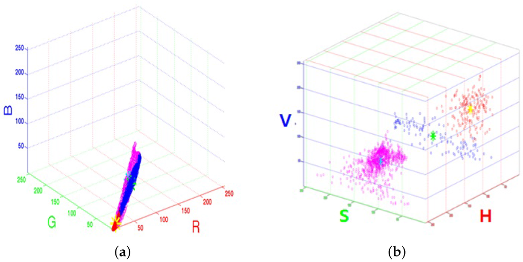 K-means clustering results in the (a) RGB and (b) HSV color spaces.