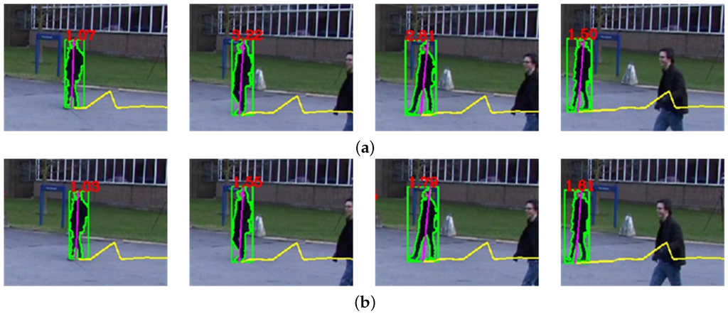 As a result, we select an ellipsoid-based human model with the minimum matching error to three human models, including child, juvenile and adult. If the matching error is greater than a threshold , the object is classified as nonhuman. If the threshold is too big, nonhuman objects are classified as human. On the other hand, very small makes human detection fail. For that reason, we chose for the experimentally best human detection performance. The shape matching results of the ellipsoid-based human model appropriately fit real objects, as shown in Figure 3, where moving pedestrians are detected and fitted by the ellipsoid-based human model. The ellipsoid-based fitting fails when a moving object is erroneously detected. However, the rest of the correct fitting results can compensate for the occasional failure.