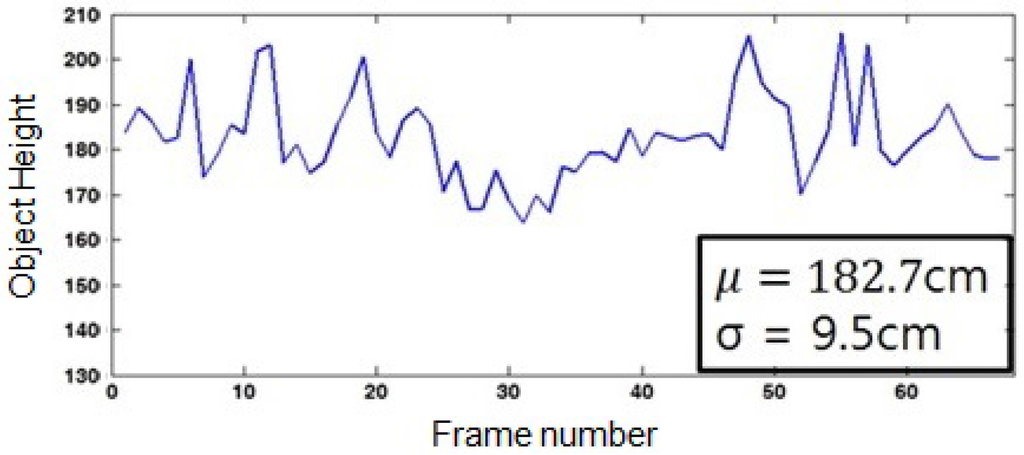 Figure 13 shows that the average object height is 182.7 cm with a standard deviation 9.5 cm. Since the real height is 175 cm, the estimation error is 7.5 cm, because the reference height was set to 180 cm. This result reveals that the proposed calibration algorithm is suitable to estimate the relative height rather than the absolute value.