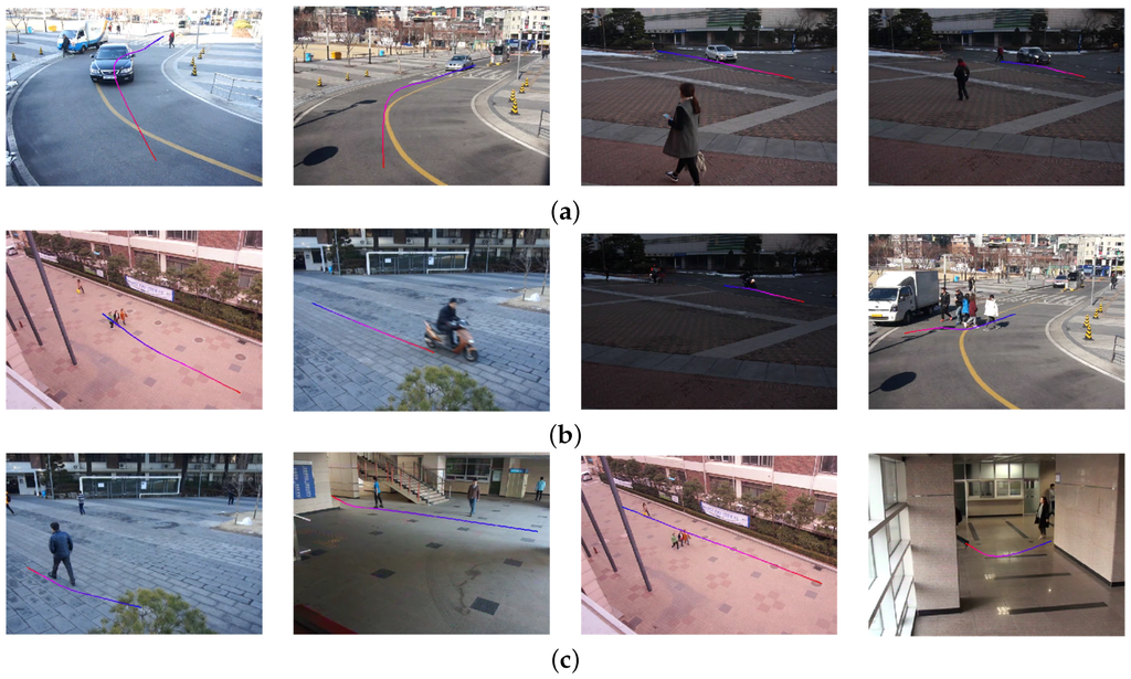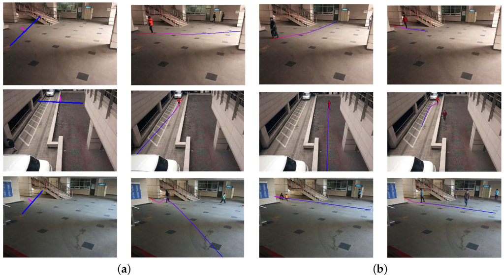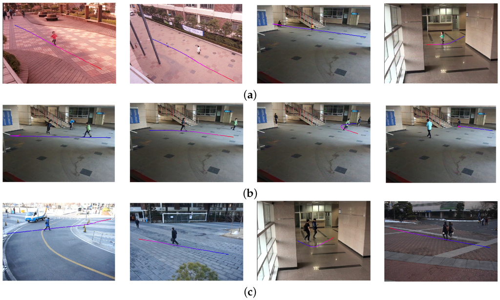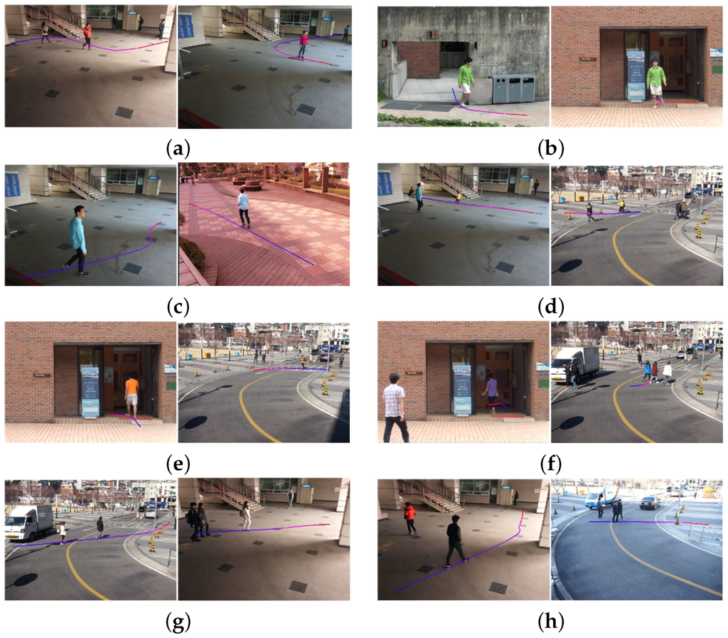 Figure 21 shows the results of the proposed algorithm for person re-identification in the wild (PRW) dataset []. As shown in the figure, the objects’ colors and trajectories are correctly classified.